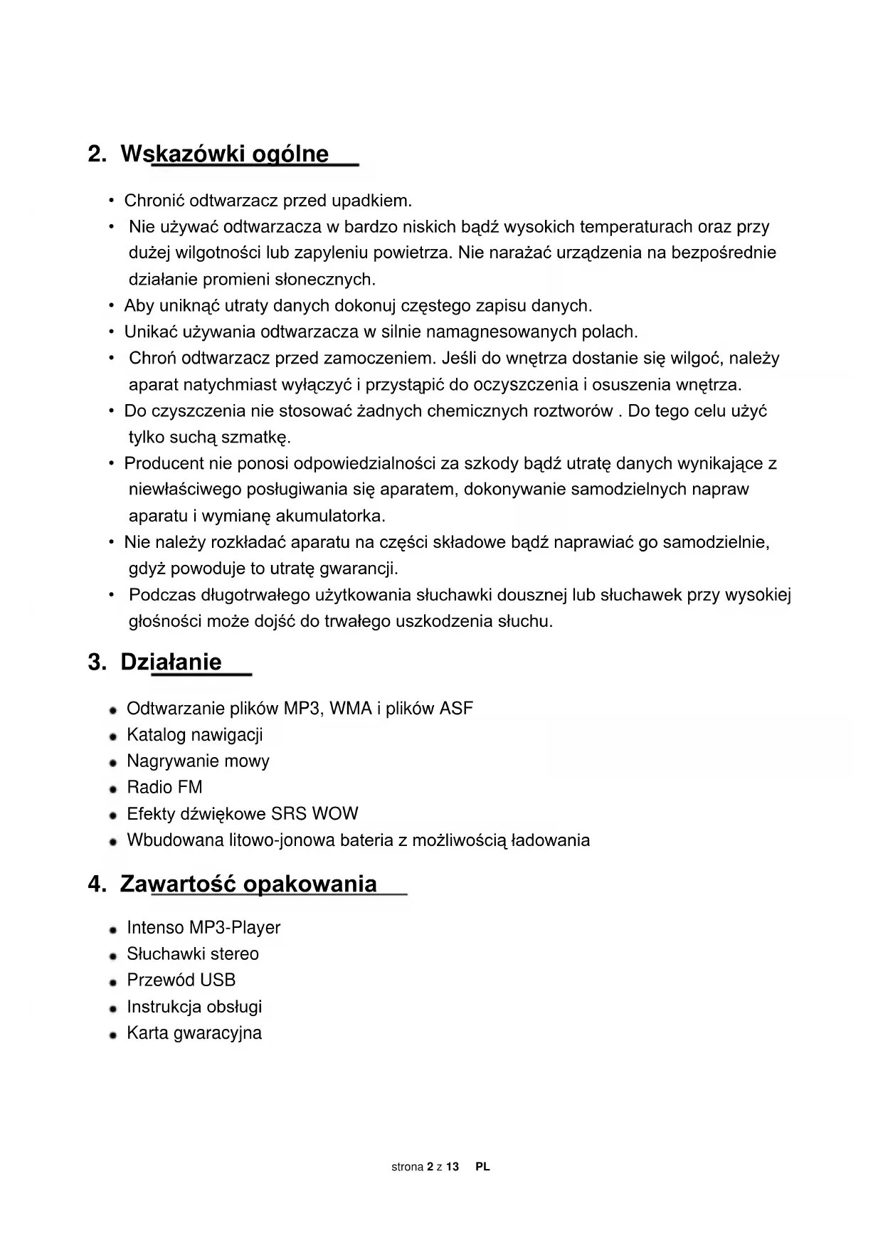 Intenso MP3-Player Słuchawki stereo Przewód USB Instrukcja obsługi Karta gwaracyjnastrona 3 z 13 PL