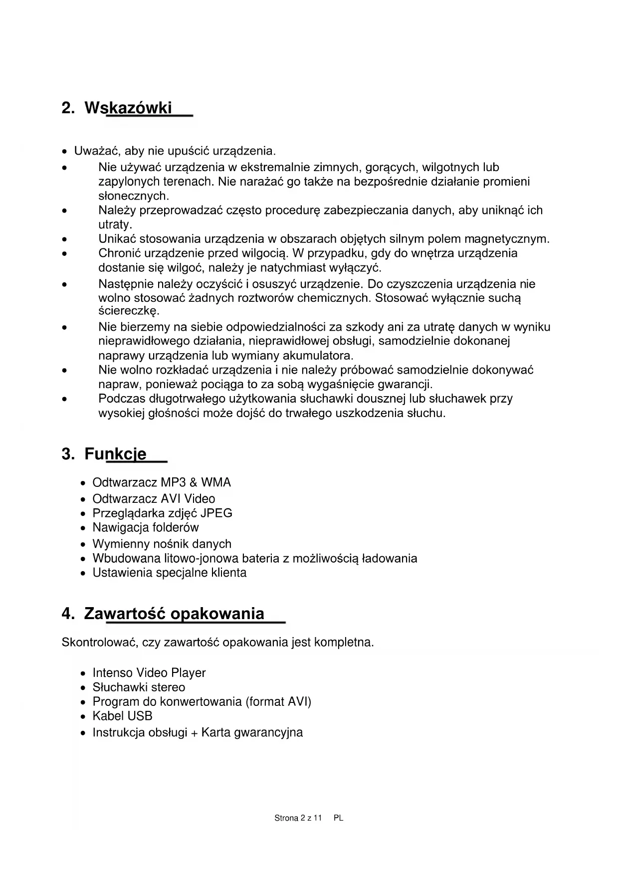 Skontrolować, czy zawartość opakowania jest kompletna. Intenso Video Player Słuchawki stereo Program do konwertowania (format AVI) Kabel USB Instrukcja obsługi + Karta gwarancyjnaStrona 3 z 11 PL