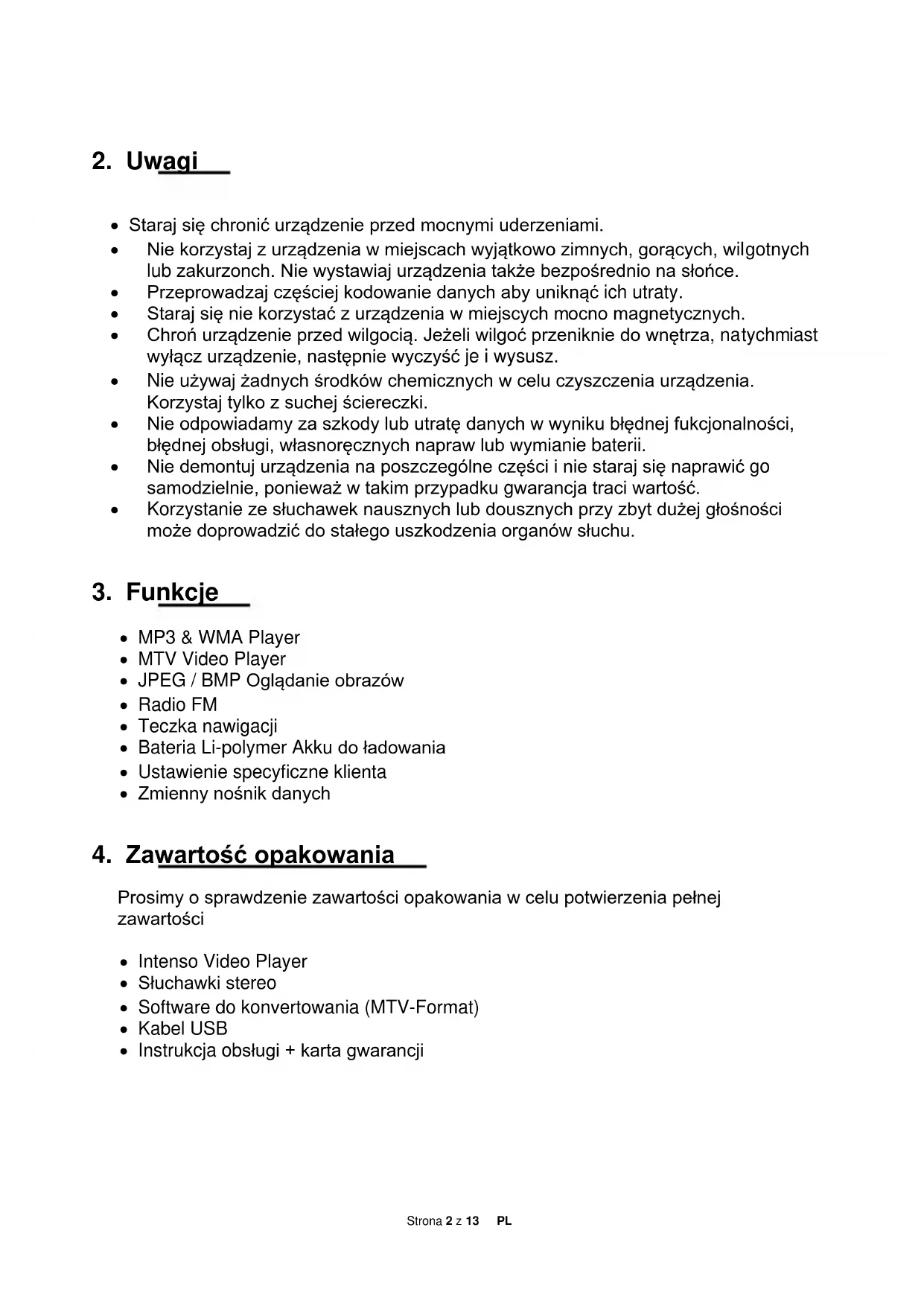 Prosimy o sprawdzenie zawartości opakowania w celu potwierzenia pełnej zawartości Intenso Video Player Słuchawki stereo Software do konvertowania (MTV-Format) Kabel USB Instrukcja obsługi + karta gwarancjiStrona 3 z 13 PL