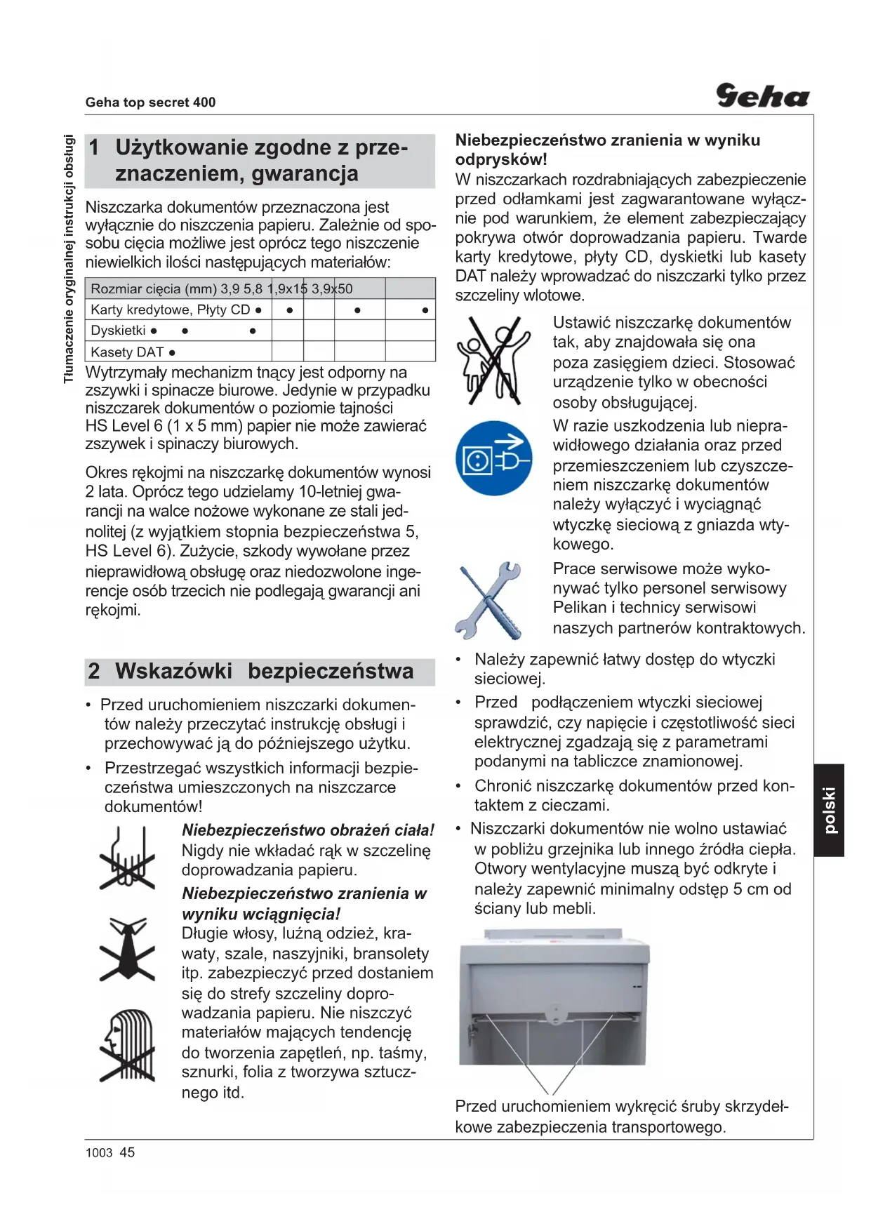 - EN 60950-1:20061003 45 Geha top secret 400 polski Niszczarka dokumentów przeznaczona jest wyłącznie do niszczenia papieru. Zależnie od spo- sobu cięcia możliwe jest oprócz tego niszczenie niewielkich ilości następujących materiałów: Rozmiar cięcia (mm) 3,9 5,8 1,9x15 3,9x50 Karty kredytowe, Płyty CD ●● ● ● Dyskietki ●● ● Kasety DAT ● Wytrzymały mechanizm tnący jest odporny na zszywki i spinacze biurowe. Jedynie w przypadku niszczarek dokumentów o poziomie tajności HS Level 6 (1 x 5 mm) papier nie może zawierać zszywek i spinaczy biurowych. Okres rękojmi na niszczarkę dokumentów wynosi 2 lata. Oprócz tego udzielamy 10-letniej gwa- rancji na walce nożowe wykonane ze stali jed- nolitej (z wyjątkiem stopnia bezpieczeństwa 5, HS Level 6). Zużycie, szkody wywołane przez nieprawidłową obsługę oraz niedozwolone inge- rencje osób trzecich nie podlegają gwarancji ani rękojmi. 1 Użytkowanie zgodne z prze- znaczeniem, gwarancja Tłumaczenie oryginalnej instrukcji obsługi Niebezpieczeństwo zranienia w wyniku odprysków! W niszczarkach rozdrabniających zabezpieczenie przed odłamkami jest zagwarantowane wyłącz- nie pod warunkiem, że element zabezpieczający pokrywa otwór doprowadzania papieru. Twarde karty kredytowe, płyty CD, dyskietki lub kasety DAT należy wprowadzać do niszczarki tylko przez szczeliny wlotowe. Ustawić niszczarkę dokumentów tak, aby znajdowała się ona poza zasięgiem dzieci. Stosować urządzenie tylko w obecności osoby obsługującej. W razie uszkodzenia lub niepra- widłowego działania oraz przed przemieszczeniem lub czyszcze- niem niszczarkę dokumentów należy wyłączyć i wyciągnąć wtyczkę sieciową z gniazda wty- kowego. Prace serwisowe może wyko- nywać tylko personel serwisowy Pelikan i technicy serwisowi naszych partnerów kontraktowych.
