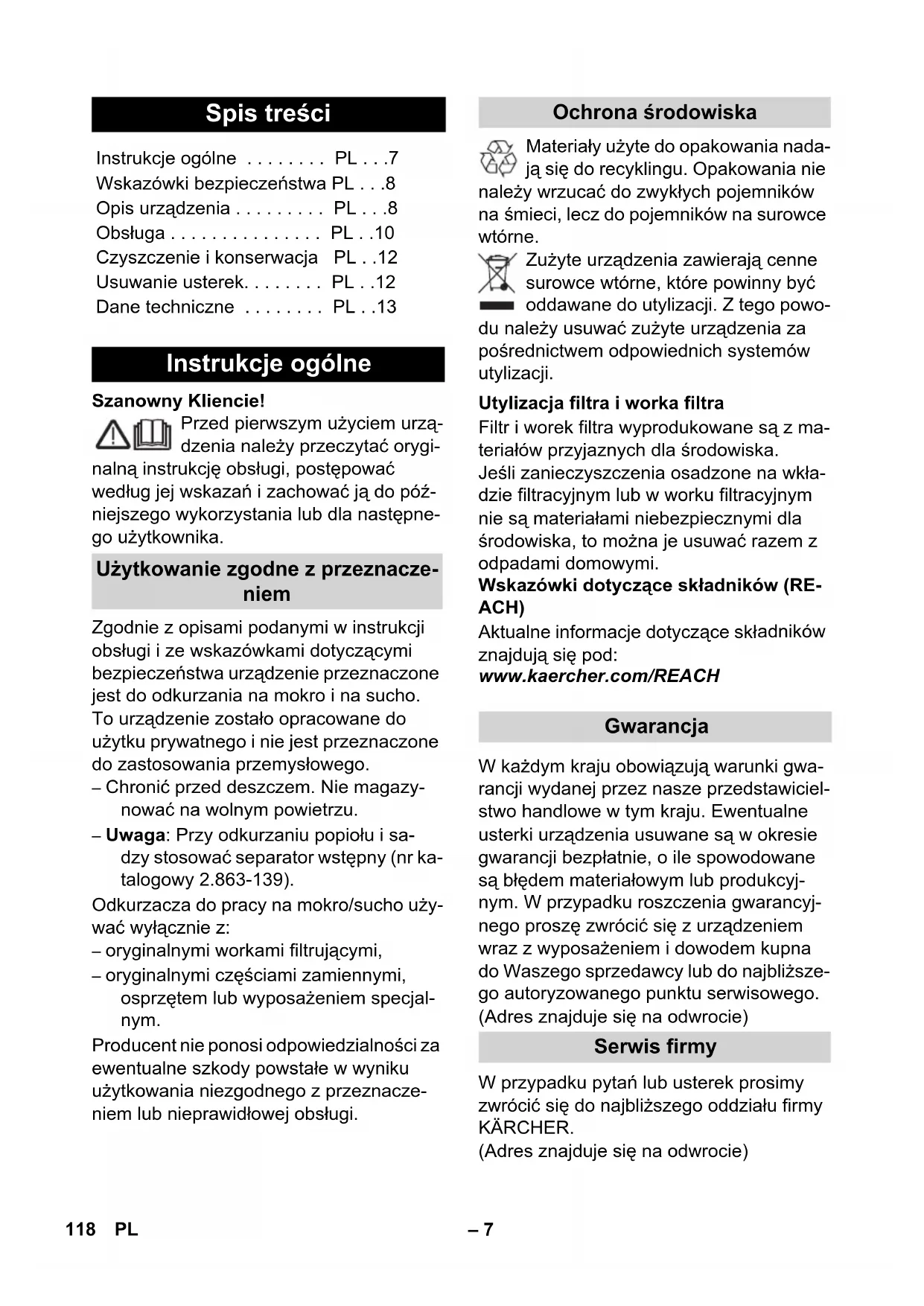 • J 1 Tehnični podatki Napetost Moč P nazivna Moč P maks. Max. priključna moč vtičnice na- prave Omrežna varovalka (inertna) Prostornina posode Pobiranje vode z ročajem Pobiranje vode s talno šobo Omrežni kabel Nivo hrupa (EN 60704-2-1) Teža (brez pribora) 117SL– 7 Szanowny Kliencie! Przed pierwszym użyciem urzą- dzenia należy przeczytać orygi- nalną instrukcję obsługi, postępować według jej wskazań i zachować ją do póź- niejszego wykorzystania lub dla następne- go użytkownika. Zgodnie z opisami podanymi w instrukcji obsługi i ze wskazówkami dotyczącymi bezpieczeństwa urządzenie przeznaczone jest do odkurzania na mokro i na sucho. To urządzenie zostało opracowane do użytku prywatnego i nie jest przeznaczone do zastosowania przemysłowego. – Chronić przed deszczem. Nie magazy- nować na wolnym powietrzu. – Uwaga: Przy odkurzaniu popiołu i sa- dzy stosować separator wstępny (nr ka- talogowy 2.863-139). Odkurzacza do pracy na mokro/sucho uży- wać wyłącznie z: – oryginalnymi workami filtrującymi, – oryginalnymi częściami zamiennymi, osprzętem lub wyposażeniem specjal- nym. Producent nie ponosi odpowiedzialności za ewentualne szkody powstałe w wyniku użytkowania niezgodnego z przeznacze- niem lub nieprawidłowej obsługi. Materiały użyte do opakowania nada- ją się do recyklingu. Opakowania nie należy wrzucać do zwykłych pojemników na śmieci, lecz do pojemników na surowce wtórne. Zużyte urządzenia zawierają cenne surowce wtórne, które powinny być oddawane do utylizacji. Z tego powo- du należy usuwać zużyte urządzenia za pośrednictwem odpowiednich systemów utylizacji. Filtr i worek filtra wyprodukowane są z ma- teriałów przyjaznych dla środowiska. Jeśli zanieczyszczenia osadzone na wkła- dzie filtracyjnym lub w worku filtracyjnym nie są materiałami niebezpiecznymi dla środowiska, to można je usuwać razem z odpadami domowymi. Wskazówki dotyczące składników (RE- ACH) Aktualne informacje dotyczące skł adników znajdują się pod: www.kaercher.com/REACH W każdym kraju obowiązują warunki gwa- rancji wydanej przez nasze przedstawiciel- stwo handlowe w tym kraju. Ewentualne usterki urządzenia usuwane są w okresie gwarancji bezpłatnie, o ile spowodowane są błędem materiałowym lub produkcyj- nym. W przypadku roszczenia gwarancyj- nego proszę zwrócić się z urządzeniem wraz z wyposażeniem i dowodem kupna do Waszego sprzedawcy lub do najbliższe- go autoryzowanego punktu serwisowego. (Adres znajduje się na odwrocie) W przypadku pytań lub usterek prosimy zwrócić się do najbliższego oddziału firmy KÄRCHER. (Adres znajduje się na odwrocie) Spis treści Instrukcje ogólne