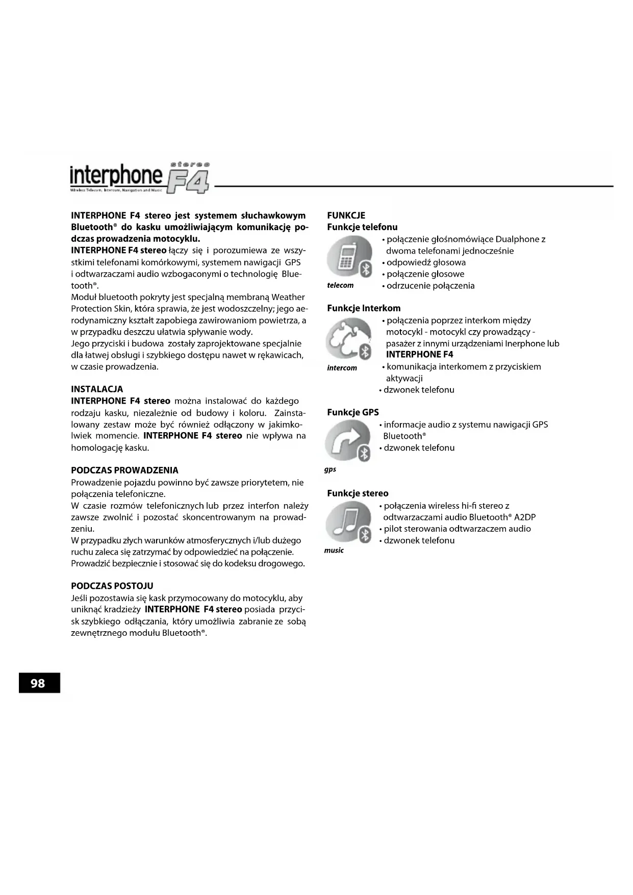 INTERPHONE F4 stereo违法犯罪 - i porozumiewa ze wszystkimi Telefonami komórkowymi, systemem nawigȩci GPS i odtrwarzaczami audio wzbogaconymi o technologie Bluetooth®.