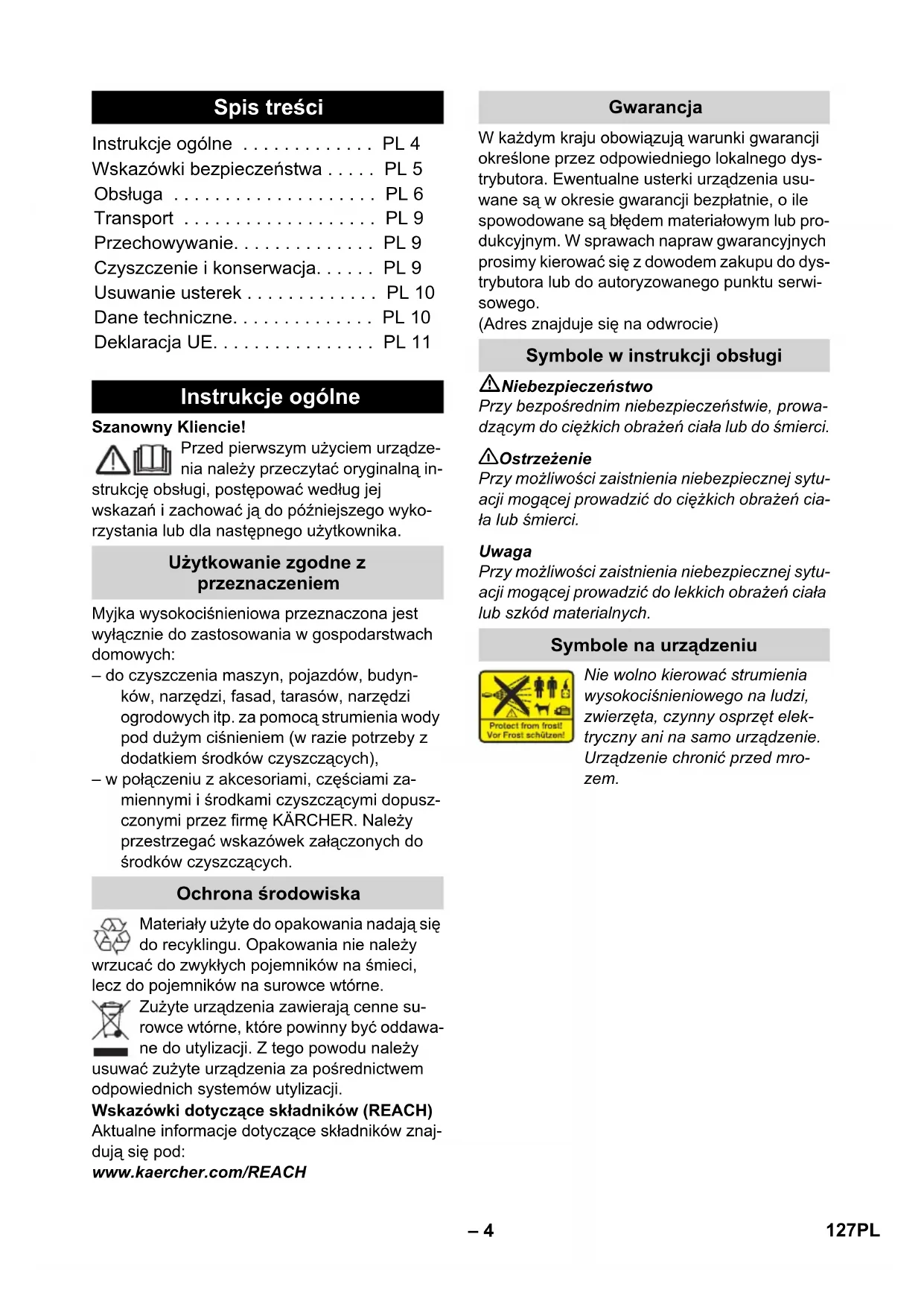 89 dB(A) ES-izjava o skladnosti Proizvod: visokotlačni čistilec Tip: 1.674-xxx Zadevne ES-direktive: 2006/42/ES (+2009/127/ES) 2004/108/ES 2000/14/ES Uporabljene usklajene norme: EN 55014–1: 2006 + A1: 2009 EN 55014–2: 1997 + A2: 2008 EN 60335–1 EN 60335–2–79 EN 61000–3–2: 2006 + A2: 2009 EN 61000–3–3: 2008 EN 62233: 2008 Postopek ocenjevanja skladnosti: 2000/14/ES: Priloga V Raven zvočne moči dB(A) Izmerjeno: 86 Zajamčeno: 89 CEO Head of Approbation 126 SL– 4 Szanowny Kliencie! Przed pierwszym użyciem urządze- nia należy przeczytać oryginalną in- strukcję obsługi, postępować według jej wskazań i zachować ją do późniejszego wyko- rzystania lub dla następnego użytkownika. Myjka wysokociśnieniowa przeznaczona jest wyłącznie do zastosowania w gospodarstwach domowych: – do czyszczenia maszyn, pojazdów, budyn- ków, narzędzi, fasad, tarasów, narzędzi ogrodowych itp. za pomocą strumienia wody pod dużym ciśnieniem (w razie potrzeby z dodatkiem środków czyszczących), – w połączeniu z akcesoriami, częściami za- miennymi i środkami czyszczącymi dopusz- czonymi przez firmę KÄRCHER. Należy przestrzegać wskazówek załączonych do środków czyszczących. Materiały użyte do opakowania nadają się do recyklingu. Opakowania nie należy wrzucać do zwykłych pojemników na śmieci, lecz do pojemników na surowce wtórne. Zużyte urządzenia zawierają cenne su- rowce wtórne, które powinny być oddawa- ne do utylizacji. Z tego powodu należy usuwać zużyte urządzenia za pośrednictwem odpowiednich systemów utylizacji. Wskazówki dotyczące składników (REACH) Aktualne informacje dotyczące składników znaj- dują się pod: www.kaercher.com/REACH W każdym kraju obowiązują warunki gwarancji określone przez odpowiedniego lokalnego dys- trybutora. Ewentualne usterki urządzenia usu- wane są w okresie gwarancji bezpłatnie, o ile spowodowane są błędem materiałowym lub pro- dukcyjnym. W sprawach napraw gwarancyjnych prosimy kierować się z dowodem zakupu do dys- trybutora lub do autoryzowanego punktu serwi- sowego. (Adres znajduje się na odwrocie) Niebezpieczeństwo Przy bezpośrednim niebezpieczeństwie, prowa- dzącym do ciężkich obrażeń ciała lub do śmierci. 몇 Ostrzeżenie Przy możliwości zaistnienia niebezpiecznej sytu- acji mogącej prowadzić do ciężkich obrażeń cia- ła lub śmierci. Uwaga Przy możliwości zaistnienia niebezpiecznej sytu- acji mogącej prowadzić do lekkich obrażeń ciała lub szkód materialnych. Nie wolno kierować strumienia wysokociśnieniowego na ludzi, zwierzęta, czynny osprzęt elek- tryczny ani na samo urządzenie. Urządzenie chronić przed mro- zem. Spis treści Instrukcje ogólne . . . . . . . . . . . . . PL 4 Wskazówki bezpieczeństwa . . . . . PL 5 Obsługa . . . . . . . . . . . . . . . . . . . . PL 6 Transport . . . . . . . . . . . . . . . . . . . PL 9 Przechowywanie. . . . . . . . . . . . . . PL 9 Czyszczenie i konserwacja. . . . . . PL 9 Usuwanie usterek . . . . . . . . . . . . . PL 10 Dane techniczne. . . . . . . . . . . . . . PL 10 Deklaracja UE. . . . . . . . . . . . . . . . PL 11 Instrukcje ogólne Użytkowanie zgodne z przeznaczeniem Ochrona środowiska Gwarancja Symbole w instrukcji obsługi Symbole na urządzeniu 127PL– 5 Niebezpieczeństwo Nigdy nie dotykać wtyczki ani gniazdka mo- krymi rękami. Nie uruchamiać urządzenia w przypadku uszkodzenia przewodu zasilającego lub ważnych części urządzenia, np. przewodu ciśnieniowego, pistoletu natryskowego lub elementów zabezpieczających. Przed każdym zastosowaniem sprawdzać, czy przewód zasilający lub wtyczka nie są uszkodzone. W przypadku uszkodzenia przewodu zasilającego niezwłocznie zlecić jego wymianę przez autoryzowany serwis lub elektryka. Przed każdym użyciem sprawdzać, czy przewód ciśnieniowy nie jest uszkodzony. Uszkodzony przewód ciśnieniowy należy niezwłocznie wymienić. Eksploatacja urządzenia w miejscach zagro- żonych wybuchem jest zabroniona. Podczas użytkowania w obszarach zagrożo- nych (np. na stacjach benzynowych) należy przestrzegać stosownych przepisów bezpie- czeństwa. W przypadku niewłaściwego użycia stru- mień wody pod ciśnieniem może być niebez- pieczny. Nie wolno kierować strumienia na ludzi, zwierzęta, czynny osprzęt elektryczny ani na samo urządzenie. Przy czyszczeniu odzieży lub obuwia nie kiero- wać strumienia na siebie ani na inne osoby. Nie czyścić strumieniem przedmiotów za- wierających materiały szkodliwe dla zdrowia (np. azbest). Strumień wody pod ciśnieniem może uszko- dzić wentyle lub opony samochodowe i do- prowadzić do pęknięcia opony. Pierwszym sygnałem takiego niebezpieczeństwa jest przebarwienie opony. Uszkodzone opony samochodowe i wentyle stanowią zagroże- nie dla życia. Podczas czyszczenia zacho- wać odległość strumienia minimum 30 cm! Niebezpieczeństwo wybuchu! Nie rozpylać cieczy palnych. Nigdy nie zasysać płynów zawierających rozpuszczalniki ani nierozcieńczonych kwa- sów czy rozpuszczalników! Zaliczają się do nich np. benzyna, rozpuszczalnik do farb lub olej grzewczy. Mgła powstająca podczas spryskiwania jest łatwo zapalna, wybuchowa i trująca. Nie zasysać acetonu, nierozcień- czonych kwasów ani rozpuszczalników, po- nieważ mają one ujemny wpływ one materiały zastosowane w urządzeniu. 몇 Ostrzeżenie Wtyczka i złączka używanego przedłużacza muszą być wodoszczelne i nie mogą leżeć w wodzie. Nieodpowiednie przedłużacze mogą być niebezpieczne. Na wolnym powietrzu należy stosować tylko dopuszczone do tego celu i odpowiednio oznaczone przedłużacze o wy- starczającym przekroju.