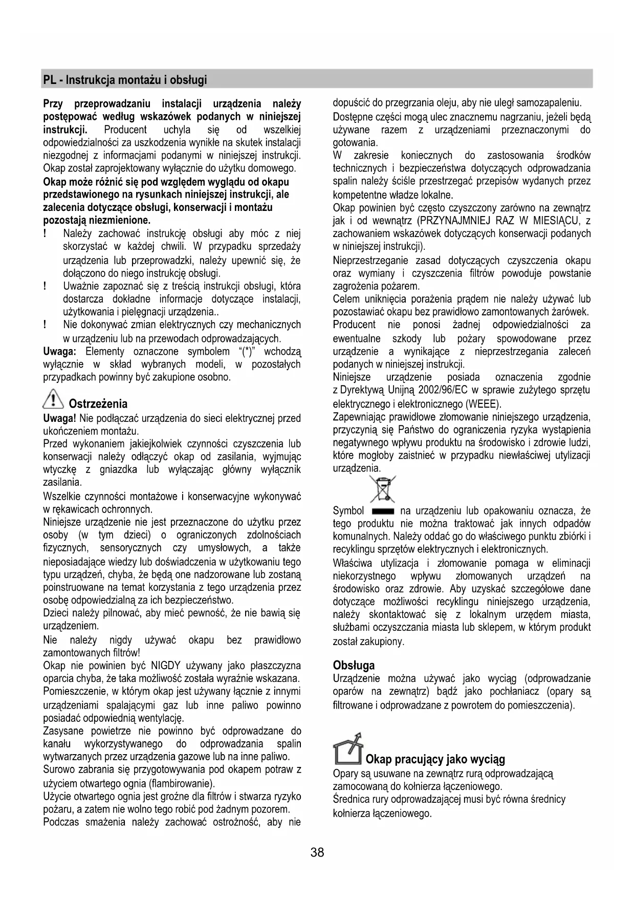 Nie należy nigdy używać okapu bez prawidłowo