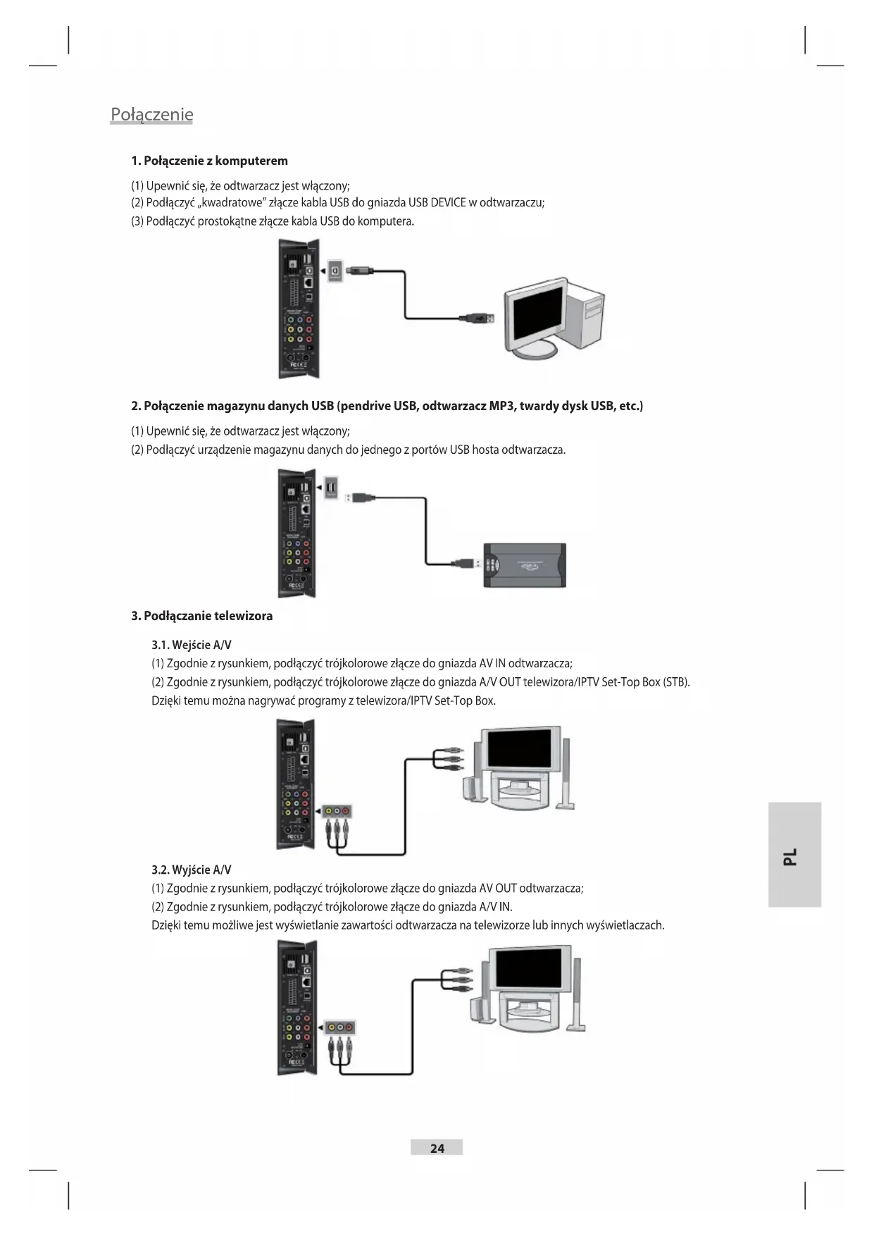 3.1. Wejście A/V (1) Zgodnie z rysunkiem, podłączyć trójkolorowe złącze do gniazda AV IN odtwarzacza; (2) Zgodnie z rysunkiem, podłączyć trójkolorowe złącze do gniazda A/V OUT telewizora/IPTV Set-Top Box (STB). Dzięki temu można nagrywać programy z telewizora/IPTV Set-Top Box. 3.2. Wyjście A/V (1) Zgodnie z rysunkiem, podłączyć trójkolorowe złącze do gniazda AV OUT odtwarzacza; (2) Zgodnie z rysunkiem, podłączyć trójkolorowe złącze do gniazda A/V IN. Dzięki temu możliwe jest wyświetlanie zawartości odtwarzacza na telewizorze lub innych wyświetlaczach.25 3.3. Wyjście SCART (1) Zgodnie z rysunkiem, podłączyć jedno ze złącz kabla SCART do gniazda SCART w odtwarzaczu; (2) Zgodnie z rysunkiem, podłączyć drugie złącze kabla SCART do gniazda SCART w telewizorze. 3.4. Złącze Component Y/Pb/Pr (1) Zgodnie z rysunkiem, podłączyć trójkolorowe złącze do gniazd Y/Pb/Pr odtwarzacza.; (2) Zgodnie z rysunkiem, podłączyć trójkolorowe złącze do gniazda Y/Pb/Pr. Postępuj zgodnie z poniższą instrukcją podłączenia audio: Pierwszy sposób: przy użyciu wyjścia audio A/V OUT; Drugi sposób: przy użyciu wyjścia audio S/PDIF optycznego. Dzięki temu, można odtwarzać muzykę, lmy oraz obrazy na telewizorze. 3.5. Wyjście HDMI (1) Zgodnie z rysunkiem, podłączyć jedno ze złącz kabla HDMI do gniazda HDMI w odtwarzaczu; (2) Zgodnie z rysunkiem, podłączyć drugie złącze kabla HDMI do gniazda HDMI w telewizorze. Dzięki temu, można osiągnąć najwyższą jakość sygnału video oraz audio poprzez pojedynczy kabel. 3.6. Wejście ANT. / RF (antenowe) Zgodnie z rysunkiem, podłączyć antenę telewizyjną do gniazda ANT. / RF IN; 3.7. Wyjście ANT. / RF (antenowe) (1) Sprawdź, czy odtwarzacz jest włączony; (2) Należy upewnić sie, że antena jest podłączona do gniazda Ant./RF IN urządzenia. (3) Jak pokazuje rysunek, należy podłączyć kabel anteny do gniazda ANT./FR OUT i podłączyć ten kabel do telewizii lub do odbiornika telewizyjnego. PL26