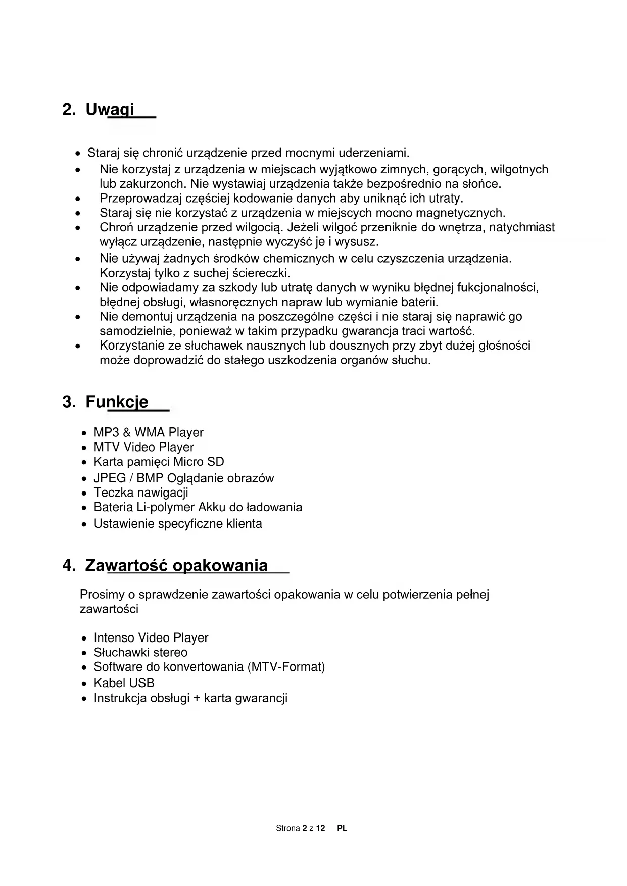 Prosimy o sprawdzenie zawartości opakowania w celu potwierzenia pełnej zawartości Intenso Video Player Słuchawki stereo Software do konvertowania (MTV-Format) Kabel USB Instrukcja obsługi + karta gwarancjiStrona 3 z 12 PL
