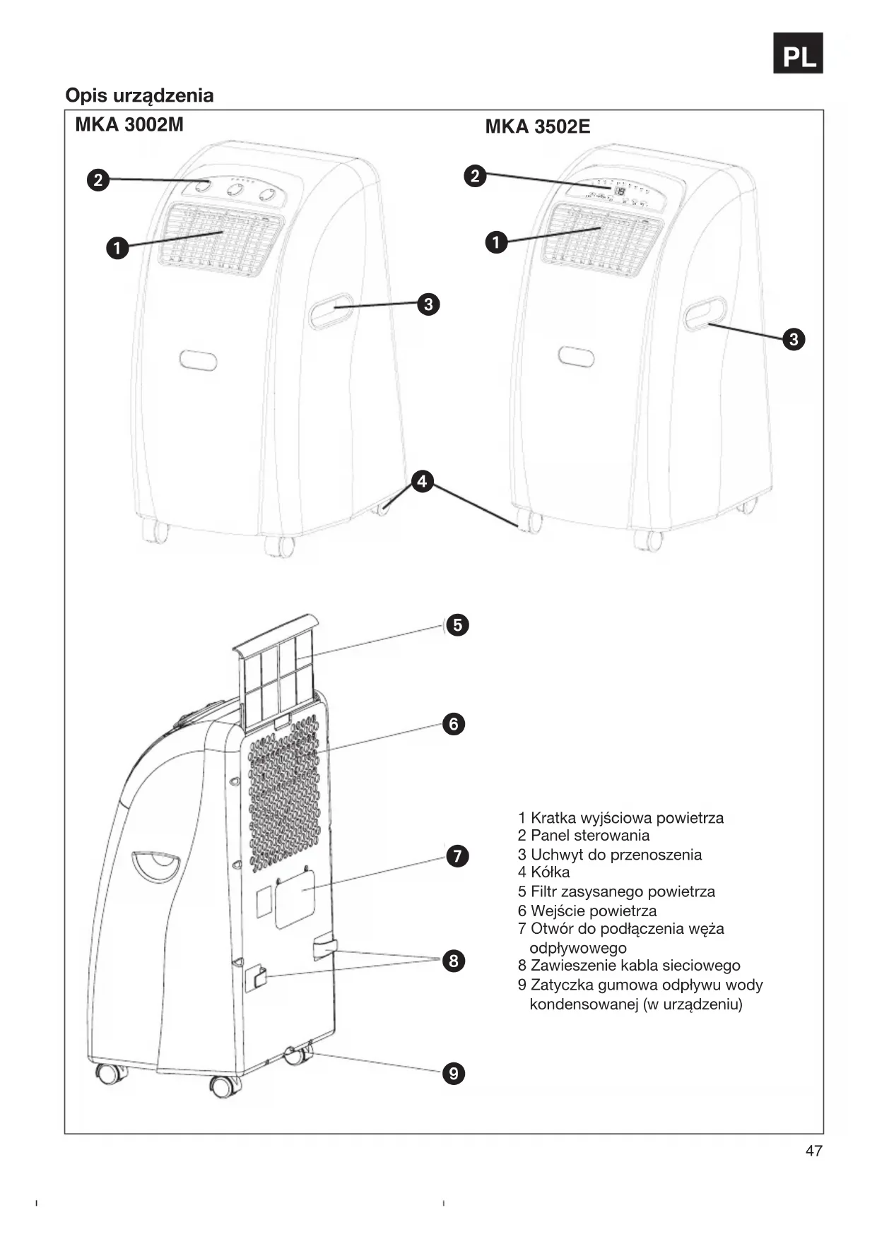 Nie włączać urządzenia mokrymi dłońmi. W przeciwnym wypadku może dojść do porażeniaprądem. Nie schładzać się bezpośrednio przez zimnepowietrze i nie doprowadzać do zbytniegoschłodzenia powietrza w pomieszczeniu. Może tospowodować złe samopoczucie lub szkodyzdrowotne. Nie ustawiać kwiatów i zwierząt bezpośrednio wprądzie zimnego powietrza. Zwierzęta i kwiatymogą z tego powodu źle się czuć. Nie wkładać palców lub innych elementów dokratek wypływu powietrza. Poruszający sięwentylator może powodować zranienia. Nie naprawiać i nie konserwować urządzenia wewłasnym zakresie. Przeprowadzone niewłaściwiemoże prowadzić do uszkodzenia urządzenia,pożar lub szkody kondensatu. Przed czyszczeniem urządzenia wyciągnąćwtyczkę z gniazdka. W przeciwnym wypadkumoże dojść do zranienia. Nie czyścić urządzenia za pomocą wody. Wprzeciwnym wypadku może dojść do pożaru. Nie używać łatwopalnych substancjiczyszczących.Może dojść do pożaru lubdeformacji obudowy. Nie dotykać części metalowych wewnątrzurządzenia w czasie wyjmowania filtru powietrza.Może dojść do zranienia. Jeśli urządzenie jest używane dłuższy czas,należy od czasu do czasu wywietrzyćpomieszczenie. W przeciwnym wypadku możedojść do zmniejszenia ilości tlenu. Nie instalować urządzenia w pomieszczeniu, wktórym mogą się ulatniać łatwopalne gazy.Ulatniający się gaz może spowodować wybuch. Nie trzymać łatwopalnych elementów w pobliżuurządzenia, aby nie mogły znajdować się wbezpośrednim działaniu prądu zimnegopowietrza. W przeciwnym wypadku może dojśćdo częściowego nadpalenia. Jeśli urządzenie nie będzie używane dłuższyczas, wyciągnąć wtyczkę z gniazdka. Odłączyć urządzenie z sieci w czasie burzy.Części elektryczne mogą przez ew. spięciezostać uszkodzone. W razie zauważenia nieszczelności w obiegiśrodka chłodzącego, skontaktować sięnatychmiast z autoryzowanym serwisem. W razie wycieku substancji chłodzącej, kontakt zogniem może spowodować powstanieszkodliwego dla zdrowia gazu. Natychmiastwyłączyć urządzenie. Aby zapobiec usterkom elektromagnetycznym,urządzenie trzymać z dala od telewizorów iradioodbiorników.Opakowanie:Aby zapobiec uszkodzeniom podczas transportu,urządzenie znajduje się w opakowaniu. Zachowaćopakowanie w celu odpowiedniego magazynowaniaurządzenia np. w zimie. Jeśli mimo to opakowanie mabyć wyrzucone, należy pamiętać, że jako materiałwtórny może być ponownie przetworzone. Wyposażenie 11 Króciec podłączeniowy12 Kółko przepustowe13 Wąż odpowietrzający14 Tworzywo piankowe (zostanie włożone przyujściu powietrza odprowadzanego przez okno)15 Tworzywo piankowe (zostanie włożone przyujściu powietrza odprowadzanego przez okno wjego wolnym obszarze. Do pomieszczenia niepowinno docierać ciepłe powietrze z zewnątrz.)16 Pokrywa osłaniająca do przepustu w murze luboknie17 Pojemnik zbierający na wodę kondensowaną18 Przewód odprowadzający wodę19 Pilot (MKA 3502 E)20 Filtr węglowy Opis elementów urządzenia MKA 3002M1. Wskaźnik napięcia sieciowego2. Wskaźnik pracy wentylatora3. Wskaźnik pracy chłodzenia4. Wskaźnik zapełnienia zbiornika na wodę