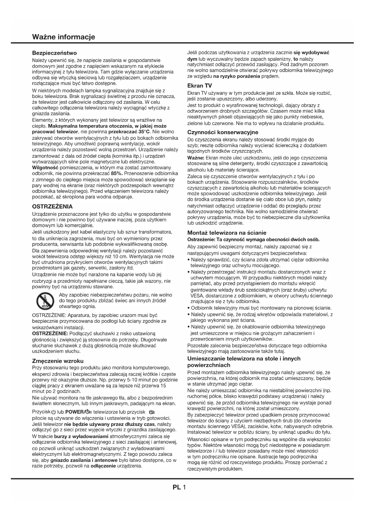 - Należy upewnić się, że okablowanie odbiornika telewizyjnego jest umieszczone w miejscu nie grożącym zahaczeniem i przewróceniem innych użytkowników. Pozostałe zalecenia bezpieczeństwa dotyczące tego odbiornika telewizyjnego mają zastosowanie także tutaj. Umieszczanie telewizora na stole i innych powierzchniach Przed montażem odbiornika telewizyjnego należy upewnić się, że powierzchnia, na której odbiornik ma zostać umieszczony, będzie w stanie utrzymać jego ciężar. Nie należy umieszczać odbiornika na niestabilnej powierzchni (np. ruchomej półce, blisko krawędzi podstawy urządzenia) i należy upewnić się, że przód odbiornika telewizyjnego nie wystaje ponad krawędź powierzchni, na której został umieszczony. By zabezpieczyć telewizor przed upadkiem proszę przymocować telewizor do ściany z użyciem niezbędnych śrub (do otworów montażu ściennego VESA), zacisków, kotw, nabywanych odrębnie. Instalować telewizor w pobliżu ściany, by uniknąć upadku do tyłu. Własności opisane w tym podręczniku są wspólne dla większości typów. Niektóre własności mogą być niedostępne w posiadanym telewizorze i / lub telewizor posiadany może mieć własności w tym podręczniku nie opisane. Ilustracje tego podręcznika mogą się różnić od rzeczywistego produktu. Proszę porównać z rzeczywistym produktem.PL 2 Informacja dla użytkowników o likwidacji starego sprzętu i baterii [Unia Europejska] Ten symbol oznacza, że sprzęt elektryczny i elektroniczny oraz baterie nie powinny, po zużyciu, być wyrzucane z innymi odpadami domowymi. Powinien być natomiast przekazany do odpowiednich punktów zbiórki dla recyklingu sprzętu elektrycznego i elektronicznego, również baterie, zgodnie z krajowymi przepisami i Dyrektywami 2002/96/EC oraz 2006/66/EC. Zapewniając prawidłową utylizację produktów pomagasz zachować zasoby naturalne, chronić środowisko i zdrowie ludzi przed potencjalnymi negatywnymi skutkami, które mogą być powodowane przez ich nieprawidłowe traktowanie odpadów. W celu uzyskania bardziej szczegółowych informacji dotyczących punktów zbiórki niniejszego produktu należy skontaktować się z władzami lokalnymi, dostawcą usług utylizacji odpadów lub sklepem, gdzie nabyto produkt. Zgodnie z przepisami krajowymi, za nieprawidłowe traktowanie odpadów mogą być nakładane kary. [Użytkownicy firmowi] Jeśli chce się produkt zlikwidować, to proszę skontaktować się z dostawcą i sprawdzić warunki umowy sprzedaży. [Inne kraje poza Unią Europejską] Symbole te są obowiązujące tylko w Unii Europejskiej. Jeśli chce się zlikwidować te pozycje, to proszę to czynić zgodnie z odpowiednim ustawodawstwem krajowym lub innymi przepisami twojego kraju dotyczącymi traktowania zużytego sprzętu elektrycznego i baterii. Uwaga: Oznakowanie Pb, poniżej symbolu baterii oznacza, że zawiera ona ołów. Produkty BateriePL 3 Polski Spis treści Ważne informacje ……………………………………… 1 Rozdział 1 - Podłączenia Podłączenie źródła zasilania i anteny ……………… 4 Nagrywarka DVD, odbiornik telewizji kablowej …… 4 Odtwarzacz DVD, system kina domowego, Komputer PC ………………………………………… 5 Konsola gier, Odtwarzacz płyt Blue-ray, słuchawki douszne, konsola do gier HD i kamera HD ………… 5 Rozdział 2 - Pierwsze kroki Funkcje pilota ………………………………………… 6 Wyłączyć telewizor i włączyć ponownie …………… 7 Rozdział 3 - Instalowanie kanałów Konfiguracja początkowa …………………………… 8 Wykonanie automatycznego wyszukiwania kanału 8 Rozdział 4 - Korzystanie z telewizora Dostęp do kanałów …………………………………… 9 Oglądanie z podłączonych urządzeń ……………… 9 Głośność ……………………………………………… 9 Korzystanie z menu telewizora ……………………… 9 Wybór języka menu …………………………………… 9 Rozdział 5 - Lepsze wykorzystanie telewizora Ustawienie ulubionych kanałów ………………… 10 Dynam. podświetlenie ECO ……………………… 10 Oglądanie TV z użyciem funkcji 3D ……………… 10 Opis audio …………………………………………… 10 Funkcja PAP ………………………………………… 10 Korzystanie z napisów ……………………………… 11 Włączanie / wyłączanie napisów ………………… 11 Włączanie języka napisów cyfrowych kanałów TV 11 Wybór typu napisów w kanałach TV cyfrowej …… 11 Wybór języka dekodowania stron teletekstu …… 11 Język Teletekstu cyfrowego ……………………… 11 Typ SPDIF …………………………………………… 11 T-Link ………………………………………………… 11 Włączanie i wyłączanie T-Link …………………… 11 Odtwarzanie za jednym przyciśnięciem ………… 11 Korzystanie z gotowości urządzenia ……………… 11 Aktualizacja sieci …………………………………… 11 Moduł CI …………………………………………… 12 Korzystanie z modułu interfejsu uniwersalnego … 12 Dostęp do usług interfejsu uniwersalnego ……… 12 Aktualizacja oprogramowania …………………… 12 Przejście na tryb Sklepu lub Domowy …………… 12 Funkcja MHEG ……………………………………… 12 Oglądanie zdjęć, odtwarzanie muzyki i wideo z urządzenia pamięci USB …………………………… 13 Zdjęcia ……………………………………………… 13 Muzyka ……………………………………………… 13 Wideo ………………………………………………… 13 Wideo DivX …………………………………………… 14 Ustawianie godziny ………………………………… 14 Przypisywanie dekodowania kanału ……………… 14 Diagnostyka kanałów telewizji cyfrow