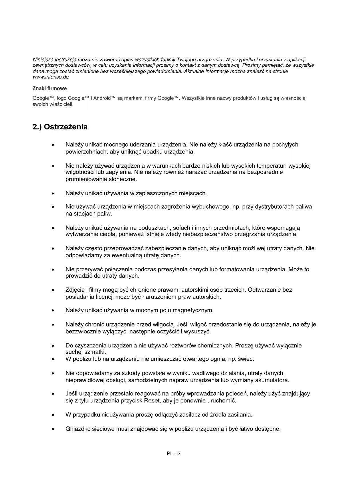 Niniejsza instrukcja要去zawiera opisu wzysztkich fungcji Twojego uradzenia. W przypadku korzystania z aplikacji zewnetrznych dostawców, w celu uzyskania informaci prosimy okontakt z danym dostawc. Prosimi pamieta, ze wzystkie dane moga zostaczmienione bez wczesniejszego powiadomienia. Aktualne informace maybeznaleć na stronie www.intenso.de