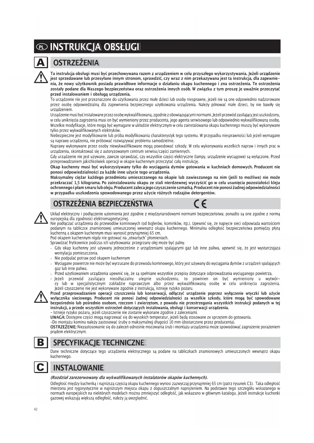 Ta instrukcja obsługi musi być przechowywana razem z urządzeniem w celu przyszłego wykorzystywania. Jeżeli urządzenie jest sprzedawane lub przesyłane innym stronom, sprawdzić, czy wraz z nim przekazywana jest ta instrukcja, dla zapewnie- nia, że nowy użytkownik posiada prawidłowe informacje o działaniu okapu kuchennego i zna ostrzeżenia. Te ostrzeżenia zostały podane dla Waszego bezpieczeństwa oraz ostrzeżenia innych osób. W związku z tym proszę je uważnie przeczytać przed instalowaniem i obsługą urządzenia. To urządzenie nie jest przeznaczone do użytkowania przez małe dzieci lub osoby niesprawne, jeżeli nie są one odpowiednio nadzorowane przez osobę odpowiedzialną dla zapewnienia bezpiecznego użytkowania urządzenia. Należy pilnować małe dzieci, by nie bawiły się urządzeniem. Urządzenie musi być instalowane przez osobę wykwalifikowaną, zgodnie z obowiązującymi normami. Jeżeli przewód zasilający jest uszkodzony, w celu uniknięcia zagrożenia musi on być wymieniony przez producenta, jego agenta serwisowego lub odpowiednio wykwalifikowaną osobę. Wszelkie modyfikacje, które mogą być wymagane w układzie elektrycznym w celu zainstalowania okapu kuchennego muszą być wykonywane tylko przez wykwalifikowanych elektryków. Niebezpieczne jest modyfikowanie lub próba modyfikowania charakterystyk tego systemu. W przypadku niesprawności lub jeżeli wymagane są naprawy urządzenia, nie próbować rozwiązywać problemu samodzielnie. Naprawy wykonywane przez osoby niewykwalifikowane mogą powodować szkody. W celu wykonywania wszelkich napraw i innych prac w urządzeniu, skontaktować się z autoryzowanym centrum serwisu/części zamiennych. Gdy urządzenie nie jest używane, zawsze sprawdzać, czy wszystkie części elektryczne (lampy, urządzenie wyciągowe) są wyłączone. Przed przeprowadzaniem jakichkolwiek operacji w okapie kuchennym przeczytać całą instrukcję. Okap kuchenny musi być wykorzystywany tylko do wyciągania dymów gotowania w kuchniach domowych. Producent nie ponosi odpowiedzialności za każde inne użycie tego urządzenia. Maksymalny ciężar każdego przedmiotu umieszczanego na okapie lub zawieszanego na nim (jeśli to możliwe) nie może przekraczać 1,5 kilograma. Po zainstalowaniu okapu ze stali nierdzewnej wyczyścić go w celu usunięcia pozostałości kleju ochronnego i plam smaru lub oleju. Producent zaleca jego czyszczenie szmatką. Producent nie ponosi żadnej odpowiedzialności w przypadku uszkodzenia spowodowanego przez użycie różnych rodzajów detergentów.