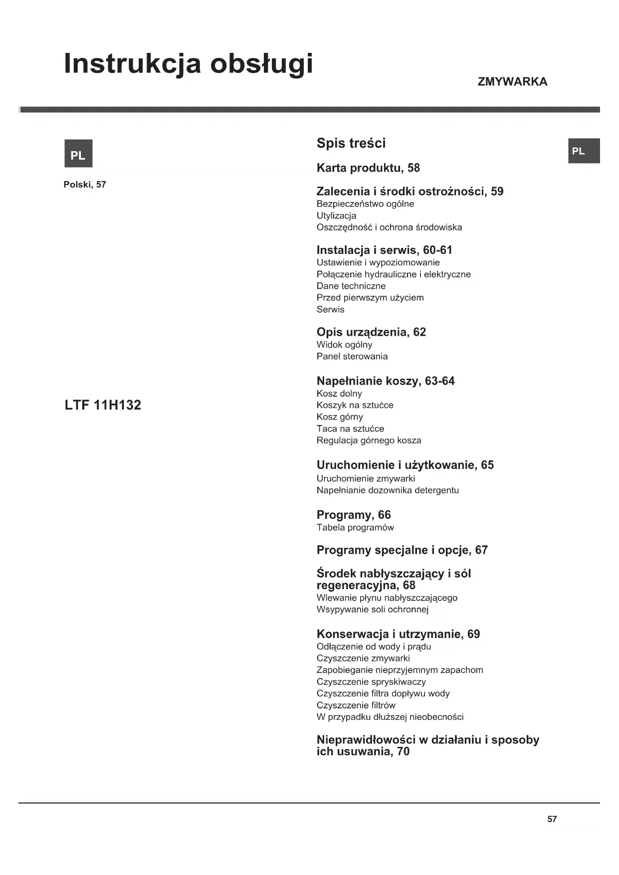 LTF 11H132 ZMYWARKA Spis treści Karta produktu, 58 Zalecenia i środki ostrożności, 59 Bezpieczeństwo ogólne Utylizacja Oszczędność i ochrona środowiska Instalacja i serwis, 60-61 Ustawienie i wypoziomowanie Połączenie hydrauliczne i elektryczne Dane techniczne Przed pierwszym użyciem Serwis Opis urządzenia, 62 Widok ogólny Panel sterowania Napełnianie koszy, 63-64 Kosz dolny Koszyk na sztućce Kosz górny Taca na sztućce Regulacja górnego kosza Uruchomienie i użytkowanie, 65 Uruchomienie zmywarki Napełnianie dozownika detergentu Programy, 66 Tabela programów Programy specjalne i opcje, 67 Środek nabłyszczający i sól regeneracyjna, 68 Wlewanie płynu nabłyszczającego Wsypywanie soli ochronnej Konserwacja i utrzymanie, 69 Odłączenie od wody i prądu Czyszczenie zmywarki Zapobieganie nieprzyjemnym zapachom Czyszczenie spryskiwaczy Czyszczenie ltra dopływu wody Czyszczenie ltrów W przypadku dłuższej nieobecności Nieprawidłowości w działaniu i sposoby ich usuwania, 70PL