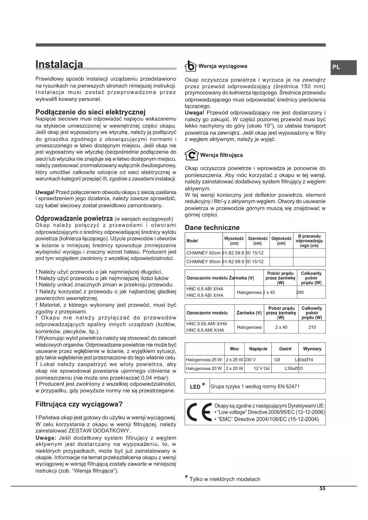 Instalacja Prawidłowy sposób instalacji urządzeniu przedstawiono na rysunkach na pierwszych stronach niniejszej instrukcji. Instalacja musi zostać przeprowadzona przez wykwalifi kowany personel. Podłączenie do sieci elektrycznej Napięcie sieciowe musi odpowiadać napięciu wskazanemu na etykiecie umieszczonej w wewnętrznej części okapu. Jeśli okap jest wyposażony we wtyczkę, należy ją podłączyć do gniazdka zgodnego z obowiązującymi normami i umieszczonego w łatwo dostępnym miejscu. Jeśli okap nie jest wyposażony we wtyczkę (bezpośrednie podłączenie do sieci) lub wtyczka nie znajduje się w łatwo dostępnym miejscu, należy zastosować znormalizowany wyłącznik dwubiegunowy, który umożliwi całkowite odcięcie od sieci elektrycznej w warunkach kategorii przepięć III, zgodnie z zasadami instalacji. Uwaga! Przed połączeniem obwodu okapu z siecią zasilania i sprawdzeniem jego działania, należy zawsze sprawdzić, czy kabel sieciowy został prawidłowo zamontowany. Odprowadzanie powietrza (w wersjach wyciągowych) Okap należy połączyć z przewodami i otworami odprowadzającymi o średnicy odpowiadającej średnicy wylotu powietrza (kołnierza łączącego). Użycie przewodów i otworów w ścianie o mniejszej średnicy spowoduje zmniejszenie wydajności wyciągu i znaczny wzrost hałasu. Producent jest pod tym względem zwolniony z wszelkiej odpowiedzialności. ! Należy użyć przewodu o jak najmniejszej długości. ! Należy użyć przewodu o jak najmniejszej ilości łuków ! Należy unikać znacznych zmian w przekroju przewodu. ! Należy korzystać z przewodu o jak najbardziej gładkiej powierzchni wewnętrznej. ! Materiał, z którego wykonany jest przewód, musi być zgodny z przepisami. ! Okapu nie należy przyłączać do przewodów odprowadzających spaliny innych urządzeń (kotłów, kominków, piecyków, itp.). ! Wykonując wylot powietrza należy się stosować do zaleceń właściwych organów. Odprowadzane powietrze nie może być usuwane przez wgłębienie w ścianie, z wyjątkiem sytuacji, gdy takie wgłębienie jest przeznaczone do tego właśnie celu. ! Lokal należy zaopatrzyć we wloty powietrza, aby okap nie spowodował powstania ujemnego ciśnienia w pomieszczeniu (nie może ono przekraczać 0,04 mbar). ! Producent jest zwolniony z wszelkiej odpowiedzialności, w przypadku, gdy powyższe normy nie są przestrzegane. Filtrująca czy wyciągowa? ! Państwa okap jest gotowy do użytku w wersji wyciągowej. W celu korzystania z okapu w wersji fi ltrującej, należy zainstalować ZESTAW DODATKOWY. Uwaga: Jeśli dodatkowy system filtrujący z węglem aktywnym jest dostarczany na wyposażeniu, to, w niektórych przypadkach, może być już zainstalowany w okapie. Informacje na temat przekształcenia okapu z wersji wyciągowej w wersję fi ltrującą zostały zawarte w niniejszej instrukcji (zob. “Wersja fi ltrująca”). Wersja wyciągowa Okap oczyszcza powietrze i wyrzuca je na zewnątrz przez przewód odprowadzający (średnica 150 mm) przymocowany do kołnierza łączącego. Średnica przewodu odprowadzającego musi odpowiadać średnicy pierścienia łączącego. Uwaga! Przewód odprowadzający nie jest dostarczony i należy go zakupić. W części poziomej przewód musi być lekko nachylony do góry (około 10°), co ułatwia transport powietrza na zewnątrz. Jeśli okap jest wyposażony w fi ltry z węgłem aktywnym, należy je wyjąć. Wersja fi ltrująca Okap oczyszcza powietrze i wprowadza je ponownie do pomieszczenia. Aby móc korzystać z okapu w tej wersji, należy zainstalować dodatkowy system fi ltrujący z węglem aktywnym. W tej wersji konieczny jest defl ektor powietrza, element redukcyjny i fi ltr/-y z aktywnym węglem. Otwory do usuwanie powietrza w przewodzie górnym muszą się znajdować w górnej części. Dane techniczne ModelWysokość (cm) Szerokość (cm) Głębokość (cm) Ø przewodu odprowadzają-cego (cm)CHIMNEY 60cm 61-82 59.8 50 15/12CHIMNEY 90cm 61-82 89.9 50 15/12Oznaczenie modelu Żarówka (V)Pobór prądu przez żarówkę (W) Całkowity pobór prądu (W)HNC 6.8 ABI X/HAHNC 9.8 ABI X/HAHalogenowa 2 x 40 290Oznaczenie modelu Żarówka (V)Pobór prądu przez żarówkę (W) Całkowity pobór prądu (W)HNC 9.6S AMI X/HAHNC 6.6 AMI X/HAHalogenowa 2 x 40 210 Moc Napięcie Gwint Wymiary Halogenowa 25 W 2 x 25 W 230 V G9 L40xØ14Halogenowa 20 W 2 x 20 W 12 V G4 L30xØ10LED *Grupa ryzyka 1 według normy EN 62471 Okapy są zgodne z następującymi Dyrektywami UE: