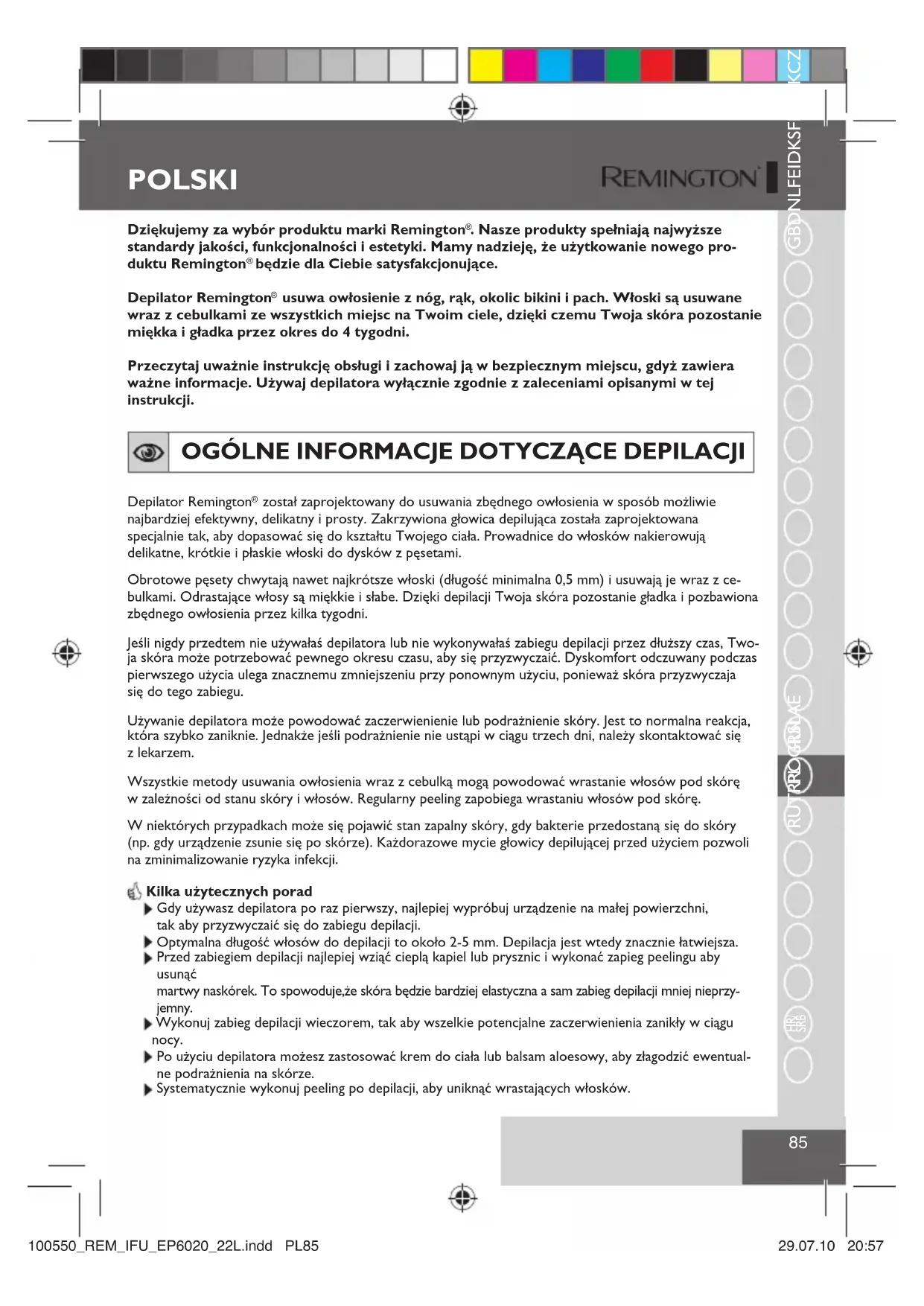 Systematycznie wykonuj peeling po depilacji, aby uniknąć wrastających włosków. POLSKI 100550_REM_IFU_EP6020_22L.indd PL85100550_REM_IFU_EP6020_22L.indd PL85 29.07.10 20:5729.07.10 20:57POLSKI
