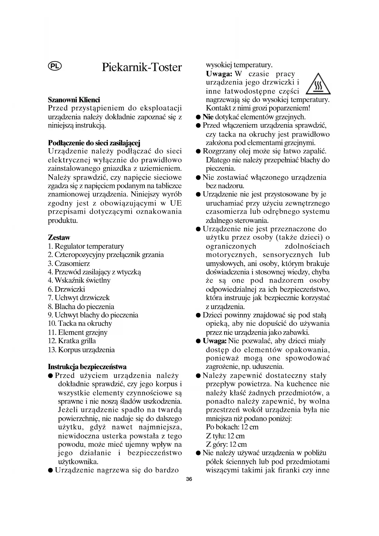 Uwaga: W czasie pracy urzadzenia loro drzwiczki i innate latwodostepne czesci nagrzewaja sie do wysokiej ten. Kontakt z nimi grozi poparzenie