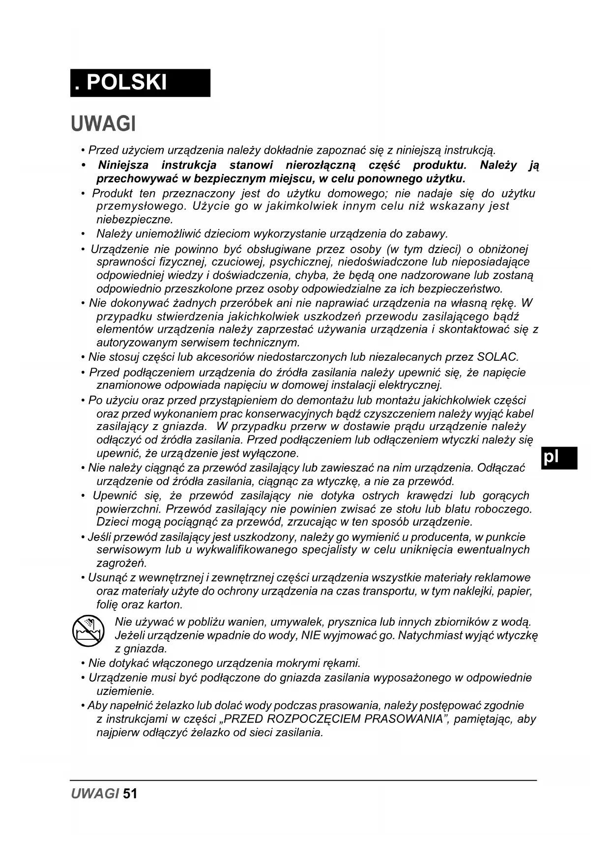 Nie uywa w pobliu wanien, umywalek, prysznica lub innych zbiorników z wod. Jeeli urzdzenie wpadnie do wody, NIE wyjmowa go. Natychmiast wyj wtyczk z gniazda.