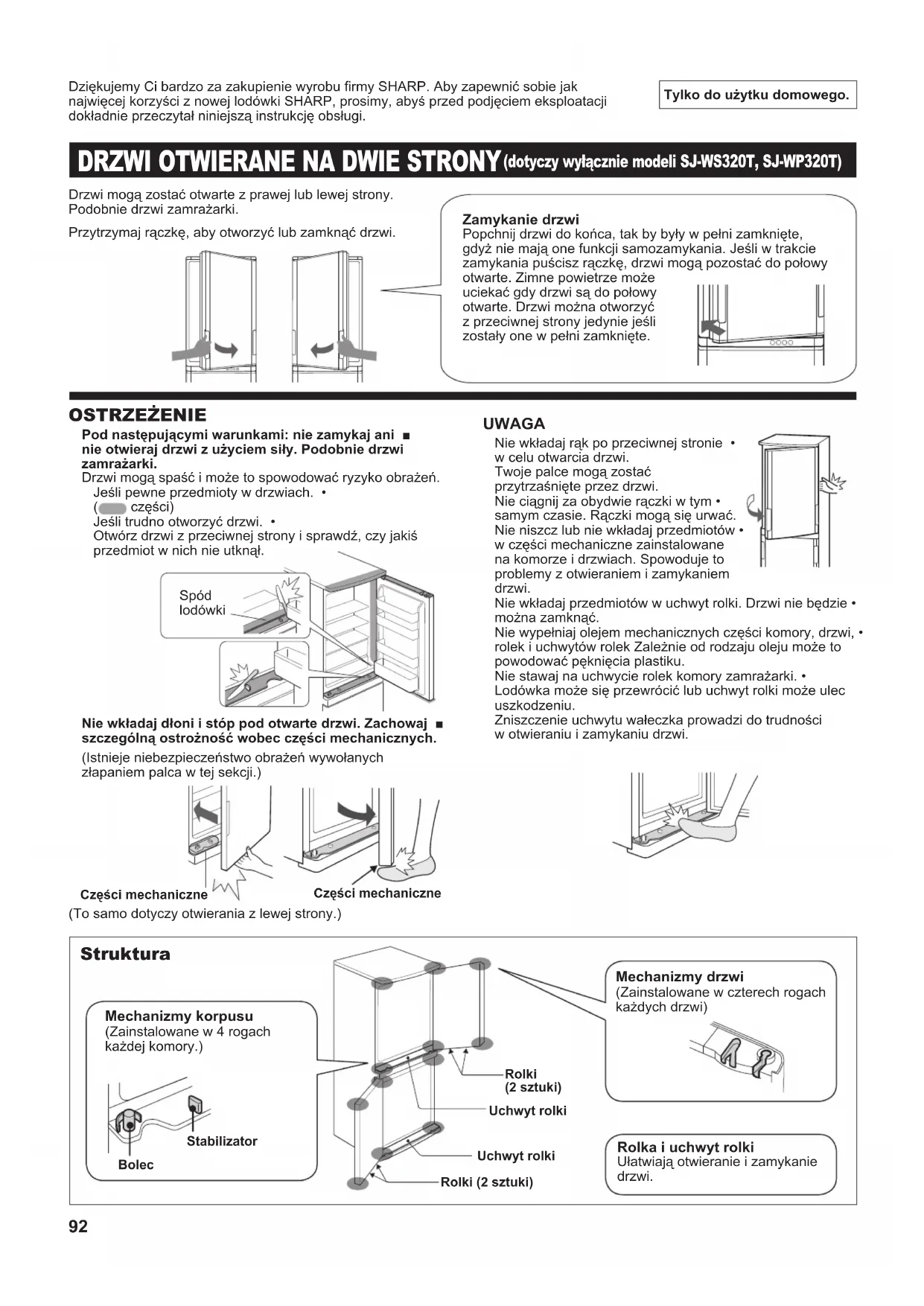 (dotyczy wyłącznie modeli SJ-WS320T, SJ-WP320T) Drzwi mogą zostać otwarte z prawej lub lewej strony.Podobnie drzwi zamrażarki.Przytrzymaj rączkę, aby otworzyć lub zamknąć drzwi. Zamykanie drzwi Popchnij drzwi do końca, tak by były w pełni zamknięte, gdyż nie mają one funkcji samozamykania. Jeśli w trakcie zamykania puścisz rączkę, drzwi mogą pozostać do połowy otwarte. Zimne powietrze może uciekać gdy drzwi są do połowy otwarte. Drzwi można otworzyć z przeciwnej strony jedynie jeśli zostały one w pełni zamknięte.(To samo dotyczy otwierania z lewej strony.) Mechanizmy korpusu (Zainstalowane w 4 rogach każdej komory.)Uchwyt rolkiRolki (2 sztuki)Rolki (2 sztuki)Uchwyt rolki Mechanizmy drzwi (Zainstalowane w czterech rogach każdych drzwi) Rolka i uchwyt rolki Ułatwiają otwieranie i zamykanie drzwi.Dziękujemy Ci bardzo za zakupienie wyrobu rmy SHARP. Aby zapewnić sobie jak najwięcej korzyści z nowej lodówki SHARP, prosimy, abyś przed podjęciem eksploatacji dokładnie przeczytał niniejszą instrukcję obsługi.Części mechaniczneStabilizatorBolecCzęści mechaniczneSpód lodówki(B107)P92-P102_Pol.indd 92 2010/09/29 16:22:2993 Lodówka zawiera palny czynnik chłodzący (R600a: ■ izobutan) i wybuchowy gaz izolacyjny (cyklopentan). Aby nie dopuścić do zapłonu i wybuchu, należy przestrzegać poniższych zasad. System chłodzący znajdujący się z tyłu i wewnątrz • lodówki wykorzystuje czynnik chłodzący. Nie należy dotykać systemu chłodzącego ostrymi przedmiotami. W celu przyspieszenia procesu rozmrażania nie używaj • urządzeń mechanicznych lub innych. (Lodówka posiada system automatycznego rozmrażania.) Nie należy używać urządzeń elektrycznych wewnątrz • lodówki. Używaj jedynie zalecanych części dla oświetlenia • komory lodówki. Nie należy blokować otworów w obudowie lodówki.• Nie używaj łatwopalnych sprayów takich jak farba w • sprayu w pobliżu lodówki. Może to spowodować wybuch lub pożar. W przypadku przebicia systemu chłodzącego nie należy • dotykać gniazdka elektrycznego w ścianie ani korzystać z otwartego ognia. Należy otworzyć okno i przewietrzyć pomieszczenie. Następnie należy skontaktować się z punktem serwisowym autoryzowanym przez rmę SHARP w celu wykonania naprawy serwisowej. Lodówkę należy usunąć w odpowiedni sposób. Należy • dostarczyć lodówkę do punktu recyklingu przystosowanego do obróbki palnych i wybuchowych gazów. Nie przechowuj silnie lotnych i łatwopalnych materiałów ■ takich jak eter, benzyna, gaz propan, aerozole w pojemnikach, klejów, czystego alkoholu etc. Materiały te mogą eksplodować. Nagromadzenie się kurzu na wtyczce przewodu zasilającego ■ może spowodować pożar. Dokładnie wycieraj kurz. Nie próbuj zmieniać konstukcji niniejszej lodówki. Aby ■ uniknąć pożaru, porażenia prądem elektrycznym lub wypadku. Dopilnuj by lodówka nie stanowiła zagrożenia dla ■ dzieci podczas przechowywania do utylizacji (np. usuń magnetyczne uszczelki drzwi, żeby zapobiec ewentualnemu zatrzaśnięciu dziecka.) OSTRZEŻENIE