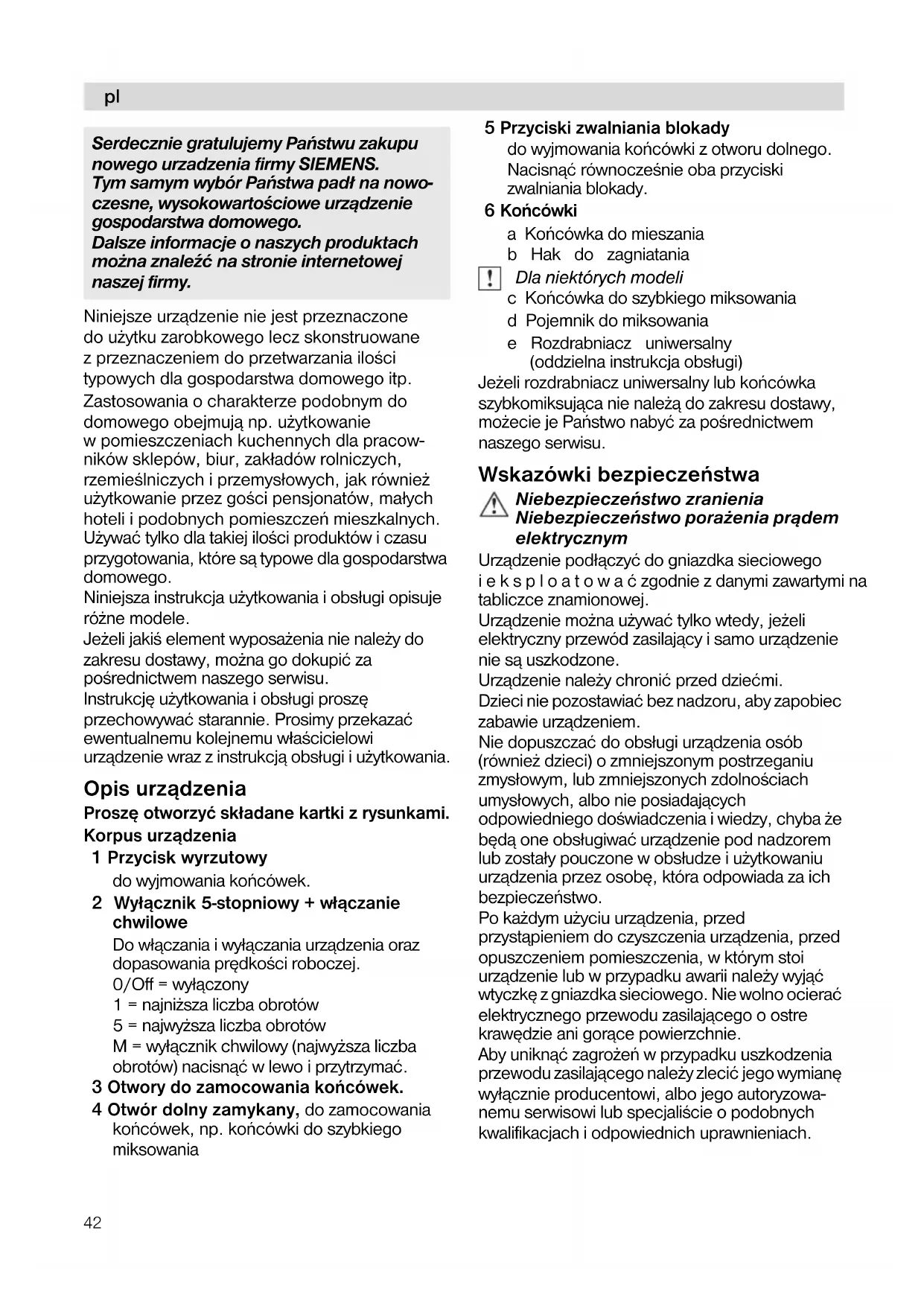 Serdecznie gratulujemy Państwu zakupu nowego urzadzenia firmy SIEMENS. Tym samym wybor Państwa podt na nowoczesne, wysokowartosciowe urzadzenia gospodarstwa domowego. Dalsze informacja o naszych produktach przyznawe znieść na stronie internetowej naszej firmy.