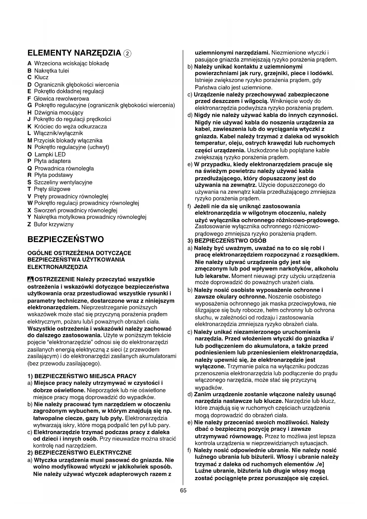 A Wrzeciona wciskając blokadę B Nakrętka tulei C Klucz D Ogranicznik głębokości wiercenia E Pokrętło dokładnej regulacji F Głowica rewolwerowa G Pokrętło regulacyjne (ogranicznik głębokości wiercenia) H Dżwignia mocujący J Pokrętło do regulacji prędkości K Króciec do węża odkurzacza L Włącznik/wyłącznik M Przycisk blokady włącznika N Pokrętło regulacyjne (uchwyt) O Lampki LED P Płyta adaptera Q Prowadnica równoległa R Płyta podstawy S Szczeliny wentylacyjne T Pręty ślizgowe V Pręty prowadnicy równoległej W Pokrętło regulacji prowadnicy równoległej X Sworzeń prowadnicy równoległej Y Nakrętka motylkowa prowadnicy równoległej Z Bufor krzywizny BEZPIECZEŃSTWO
