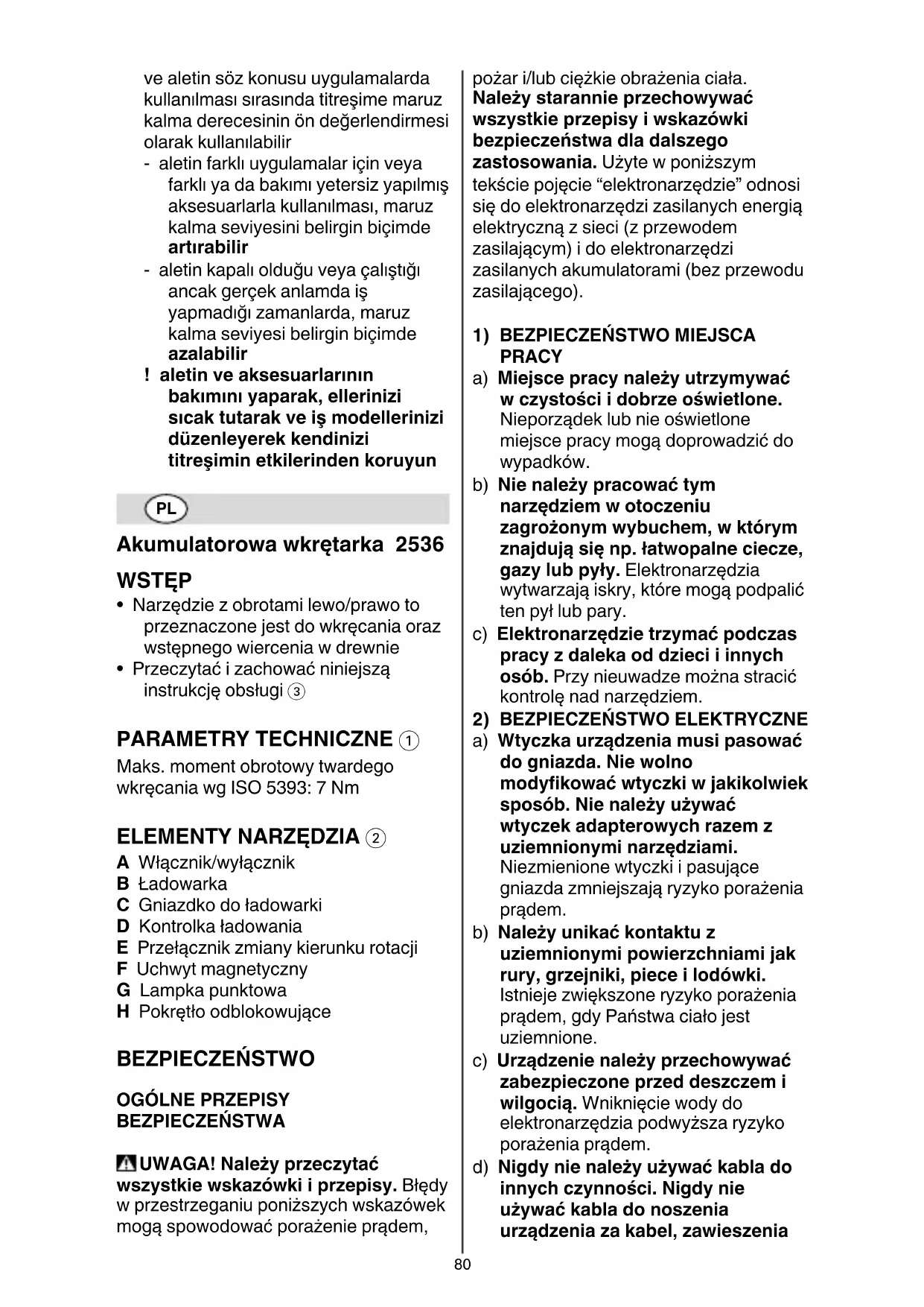 A Włącznik/wyłącznik B Ładowarka C Gniazdko do ładowarki D Kontrolka ładowania E Przełącznik zmiany kierunku rotacji F Uchwyt magnetyczny G Lampka punktowa H Pokrętło odblokowujące BEZPIECZEŃSTWO