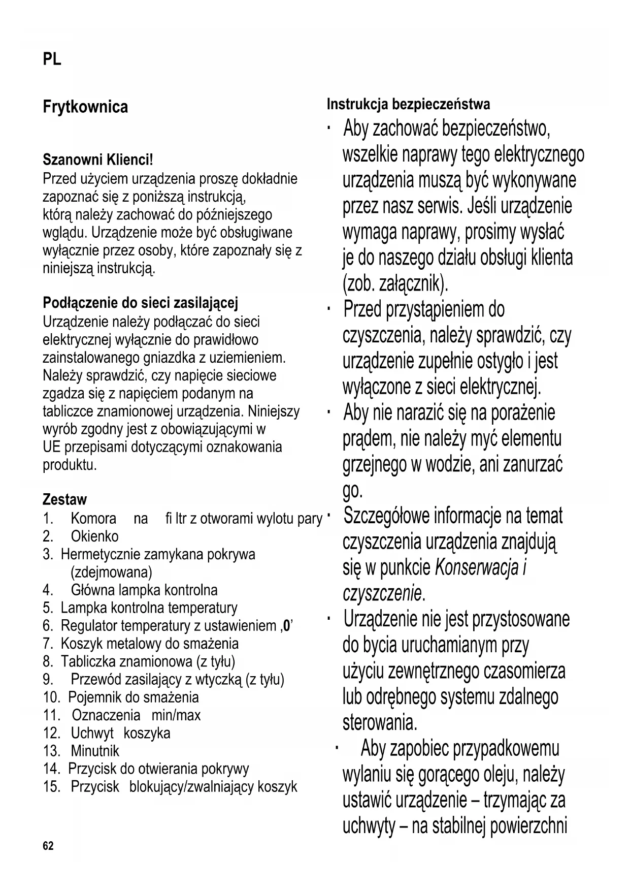 Instrukcja bezpieczeństwa ∙ Aby zachować bezpieczeństwo, wszelkie naprawy tego elektrycznego urządzenia muszą być wykonywane przez nasz serwis. Jeśli urządzenie wymaga naprawy, prosimy wysłać je do naszego działu obsługi klienta (zob. załącznik). ∙ Przed przystąpieniem do czyszczenia, należy sprawdzić, czy urządzenie zupełnie ostygło i jest wyłączone z sieci elektrycznej. ∙ Aby nie narazić się na porażenie prądem, nie należy myć elementu grzejnego w wodzie, ani zanurzać go. ∙ Szczegółowe informacje na temat czyszczenia urządzenia znajdują się w punkcie Konserwacja i czyszczenie. ∙ Urządzenie nie jest przystosowane do bycia uruchamianym przy użyciu zewnętrznego czasomierza lub odrębnego systemu zdalnego sterowania. ∙ Aby zapobiec przypadkowemu wylaniu się gorącego oleju, należy ustawić urządzenie – trzymając za uchwyty – na stabilnej powierzchni PL63 odpornej na wysokie temperatury, rozpryski i plamy; należy również zapewnić wystarczającą przestrzeń wokół urządzenia.
