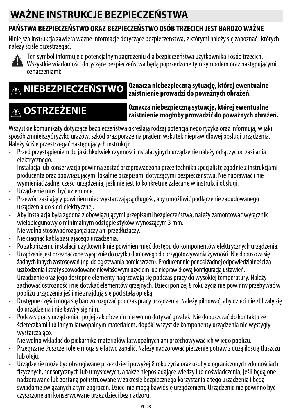 PAŃSTWA BEZPIECZEŃSTWO ORAZ BEZPIECZEŃSTWO OSÓB TRZECICH JEST BARDZO WAŻNE Niniejsza instrukcja zawiera ważne informacje dotyczące bezpieczeństwa, z którymi należy się zapoznać i których należy ściśle przestrzegać. Ten symbol informuje o potencjalnym zagrożeniu dla bezpieczeństwa użytkownika i osób trzecich. Wszystkie wiadomości dotyczące bezpieczeństwa będą poprzedzone tym symbolem oraz następującymi oznaczeniami: NIEBEZPIECZEŃSTWO Oznacza niebezpieczną sytuację, której ewentualne zaistnienie prowadzi do poważnych obrażeń. OSTRZEŻENIE Oznacza niebezpieczną sytuację, której ewentualne zaistnienie mogłoby prowadzić do poważnych obrażeń. Wszystkie komunikaty dotyczące bezpieczeństwa określają rodzaj potencjalnego ryzyka oraz informują, w jaki sposób zmniejszyć ryzyko urazów, szkód oraz porażenia prądem wskutek nieprawidłowej obsługi urządzenia. Należy ściśle przestrzegać następujących instrukcji: - Przed przystąpieniem do jakichkolwiek czynności instalacyjnych urządzenie należy odłączyć od zasilania elektrycznego. - Instalacja lub konserwacja powinna zostać przeprowadzona przez technika specjalistę zgodnie z instrukcjami producenta oraz obowiązującymi lokalnie przepisami dotyczącymi bezpieczeństwa. Nie naprawiać i nie wymieniać żadnej części urządzenia, jeśli nie jest to konkretnie zalecane w instrukcji obsługi. - Urządzenie musi być uziemione. - Przewód zasilający powinien mieć wystarczającą długość, aby umożliwić podłączenie zabudowanego urządzenia do sieci elektrycznej. - Aby instalacja była zgodna z obowiązującymi przepisami bezpieczeństwa, należy zamontować wyłącznik wielobiegunowy o minimalnym odstępie styków wynoszącym 3 mm. - Nie wolno stosować rozgałęziaczy ani przedłużaczy. - Nie ciągnąć kabla zasilającego urządzenia. - Po zakończeniu instalacji użytkownik nie powinien mieć dostępu do komponentów elektrycznych urządzenia. - Urządzenie jest przeznaczone wyłącznie do użytku domowego do przygotowywania żywności. Nie dopuszcza się żadnych innych zastosowań (np. do ogrzewania pomieszczeń). Producent nie ponosi żadnej odpowiedzialności za uszkodzenia i straty spowodowane niewłaściwym użyciem lub nieprawidłową konfiguracją ustawień. - Urządzenie oraz jego dostępne elementy nagrzewają się podczas pracy do wysokiej temperatury. Należy zachować ostrożność i nie dotykać elementów grzejnych. Dzieci poniżej 8 roku życia nie powinny przebywać w pobliżu urządzenia jeśli nie znajdują się pod stałą opieką. - Dostępne części mogą się bardzo rozgrzać podczas pracy urządzenia. Należy pilnować, aby dzieci nie zbliżały się do urządzenia i nie bawiły się nim. - Podczas pracy urządzenia i po jej zakończeniu nie wolno dotykać grzałek. Nie dopuszczać do kontaktu ze ściereczkami lub innym łatwopalnym materiałem, dopóki wszystkie komponenty urządzenia nie wystygły wystarczająco. - Nie wolno wkładać do piekarnika materiałów łatwopalnych ani przechowywać ich w jego pobliżu. - Przegrzane tłuszcze i oleje mogą się łatwo zapalić. Należy nadzorować pieczenie potraw z dużą ilością tłuszczu lub oleju. - Urządzenie może być obsługiwane przez dzieci powyżej 8 roku życia oraz osoby o ograniczonych zdolnościach fizycznych, sensorycznych lub umysłowych, a także nieposiadające wiedzy lub doświadczenia, jeśli będą one nadzorowane lub zostaną poinstruowane w zakresie bezpiecznego korzystania z tego urządzenia i będą świadome związanych z tym zagrożeń. Dzieci nie mogą bawić się urządzeniem. Urządzenie nie powinno być czyszczone ani konserwowane przez dzieci bez nadzoru. PL108 - Nie kłaść na polu grzejnym przedmiotów metalowych, np. przyrządów kuchennych (noży, widelców, łyżek,…), pokrywek ani innych podobnych, ponieważ mogą się one rozgrzać do wysokiej temperatury. - We wnęce pod urządzeniem należy zainstalować panel oddzielający, który nie został dostarczony w komplecie. - Jeśli na powierzchni pojawią się pęknięcia, należy wyłączyć urządzenie, aby uniknąć ryzyka porażenia prądem elektrycznym. - Urządzenia nie można włączać przy pomocy zewnętrznego timera ani oddzielnego systemu zdalnego sterowania. - Pozostawienie urządzenia bez nadzoru podczas przyrządzania potraw z użyciem oleju i tłuszczu może spowodować zagrożenie oraz może prowadzić do pożaru. Pożaru NIGDY nie wolno gasić wodą! Należy wyłączyć urządzenie i przykryć ogień np. pokrywką lub kocem gaśniczym. Ryzyko pożaru: nie przechowywać żadnych rzeczy na powierzchniach gotowania. - Nie stosować urządzeń czyszczących parą! - Na powierzchni płyty nie wolno kłaść sztućców ani pokrywek do garnków, gdyż mogą się one rozgrzać do wysokiej temperatury. - Po zakończeniu używania płyty należy wyłączyć pole grzejne za pomocą pokrętła a nie polegać na układzie wykrywania obecności naczynia. PL109