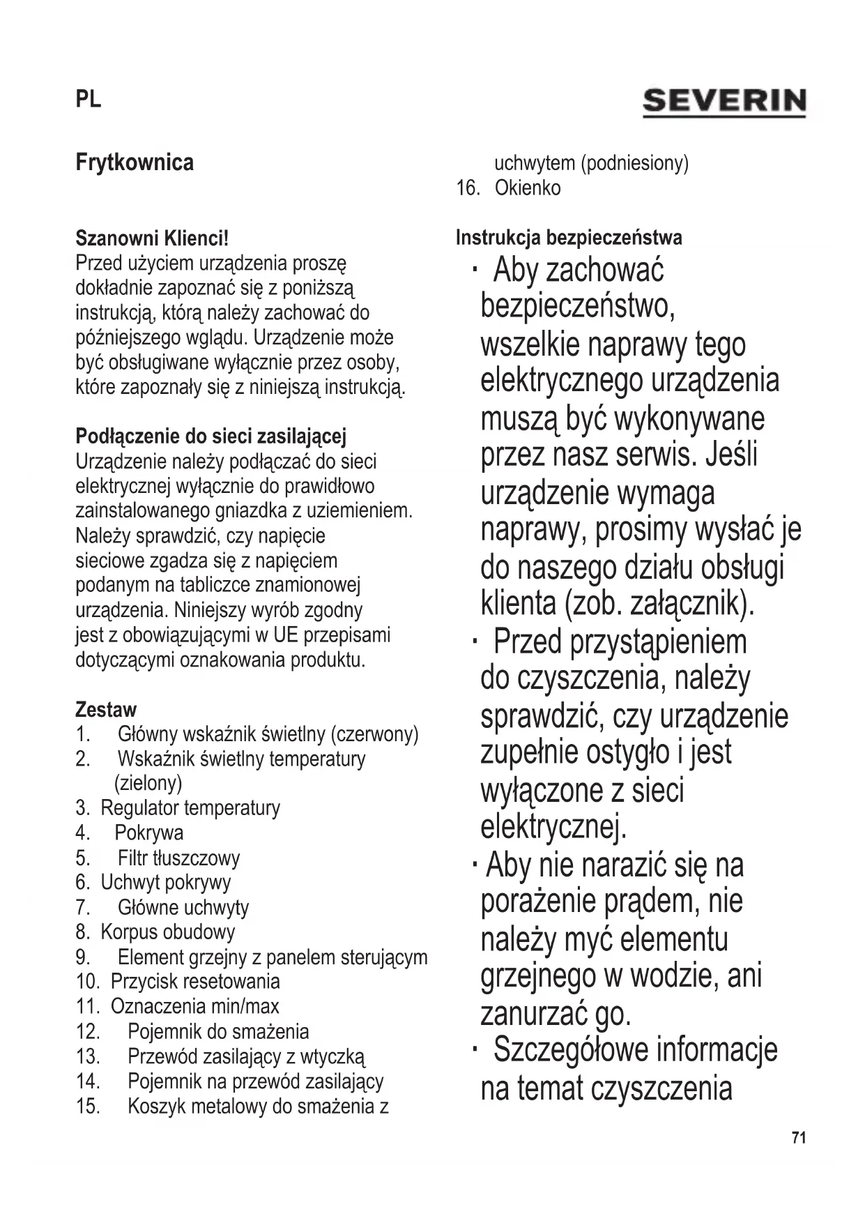 Frytkownica Szanowni Klienci! Przedużyciemurządzeniaproszę dokładniezapoznaćsięzponiższą instrukcją,którąnależyzachowaćdo późniejszegowglądu.Urządzeniemoże byćobsługiwanewyłącznieprzezosoby, którezapoznałysięzniniejsząinstrukcją. Podłączenie do sieci zasilającej Urządzenienależypodłączaćdosieci elektrycznejwyłączniedoprawidłowo zainstalowanego gniazdka z uziemieniem. Należysprawdzić,czynapięcie sieciowezgadzasięznapięciem podanym na tabliczce znamionowej urządzenia.Niniejszywyróbzgodny jestzobowiązującymiwUEprzepisami dotyczącymioznakowaniaproduktu. Zestaw