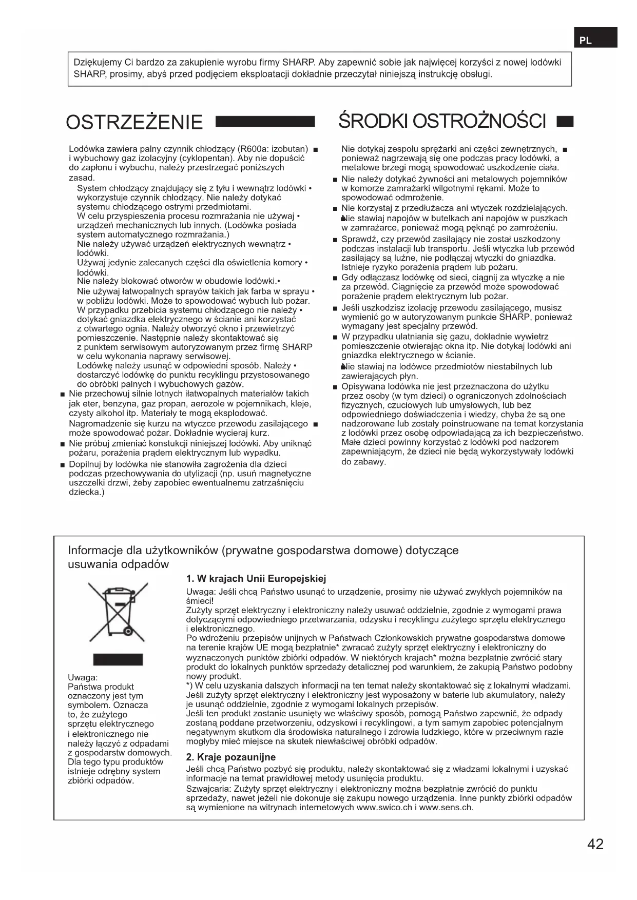 ŚRODKI OSTROŻNOŚCI Nie dotykaj zespołu sprężarki ani części zewnętrznych, ■ponieważ nagrzewają się one podczas pracy lodówki, a metalowe brzegi mogą spowodować uszkodzenie ciała. Nie należy dotykać żywności ani metalowych pojemników ■ w komorze zamrażarki wilgotnymi rękami. Może to spowodować odmrożenie. Nie korzystaj z przedłużacza ani wtyczek rozdzielających. ■ Nie stawiaj napojów w butelkach ani napojów w puszkach ■w zamrażarce, ponieważ mogą pęknąć po zamrożeniu. Sprawdź, czy przewód zasilający nie został uszkodzony ■ podczas instalacji lub transportu. Jeśli wtyczka lub przewód zasilający są luźne, nie podłączaj wtyczki do gniazdka. Istnieje ryzyko porażenia prądem lub pożaru. Gdy odłączasz lodówkę od sieci, ciągnij za wtyczkę a nie ■ za przewód. Ciągnięcie za przewód może spowodować porażenie prądem elektrycznym lub pożar. Jeśli uszkodzisz izolację przewodu zasilającego, musisz ■ wymienić go w autoryzowanym punkcie SHARP, ponieważ wymagany jest specjalny przewód. W przypadku ulatniania się gazu, dokładnie wywietrz ■ pomieszczenie otwierając okna itp. Nie dotykaj lodówki ani gniazdka elektrycznego w ścianie.Nie stawiaj na lodówce przedmiotów niestabilnych lub ■zawierających płyn. Opisywana lodówka nie jest przeznaczona do użytku ■ przez osoby (w tym dzieci) o ograniczonych zdolnościach fizycznych, czuciowych lub umysłowych, lub bez odpowiedniego doświadczenia i wiedzy, chyba że są one nadzorowane lub zostały poinstruowane na temat korzystania z lodówki przez osobę odpowiadającą za ich bezpieczeństwo. Małe dzieci powinny korzystać z lodówki pod nadzorem zapewniającym, że dzieci nie będą wykorzystywały lodówki do zabawy. Informacje dla użytkowników (prywatne gospodarstwa domowe) dotyczące
