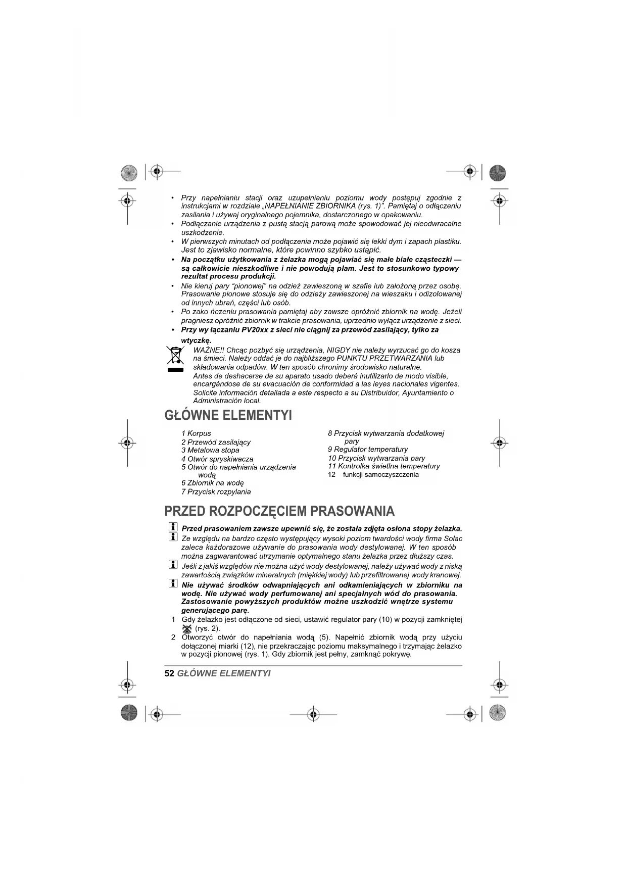 Przed prasowaniem zawsze upewni! si", #e zosta$a zdj"ta os$ona stopy #elazka. Ze wzgl du na bardzo cz sto wyst puj!cy wysoki poziom twardo"ci wody firma Solac zaleca ka#dorazowe u#ywanie do prasowania wody destylowanej. W ten sposób mo#na zagwarantowa$ utrzymanie optymalnego stanu #elazka przez d%u#szy czas. Je"li z jaki" wzgl dów nie mo#na u#y$ wody destylowanej, nale#y u#ywa$ wody z nisk! zawarto"ci! zwi!zków mineralnych (mi kkiej wody) lub przefiltrowanej wody kranowej. Nie u#ywa! %rodków odwapniaj&cych ani odkamieniaj&cych w zbiorniku na wod". Nie u#ywa! wody perfumowanej ani specjalnych wód do prasowania. Zastosowanie powy#szych produktów mo#ne uszkodzi! wn"trze systemu generuj&cego par". 1 Gdy elazko jest od!"czone od sieci, ustawi# regulator pary (10) w pozycji zamkni$tej (rys. 2). 2 Otworzy# otwór do nape!niania wod" (5). Nape!ni# zbiornik wod" przy u yciu do!"czonej miarki (12), nie przekraczaj"c poziomu maksymalnego i trzymaj"c elazko w pozycji pionowej (rys. 1). Gdy zbiornik jest pe!ny, zamkn"# pokryw$. 1 Korpus2 Przewód zasilaj!cy3 Metalowa stopa4 Otwór spryskiwacza5 Otwór do nape%niania urz!dzenia wod!6 Zbiornik na wod 7 Przycisk rozpylania8 Przycisk wytwarzania dodatkowej pary 9 Regulator temperatury10 Przycisk wytwarzania pary11 Kontrolka "wietlna temperatury !""""#$%&'()"*+,-'./*.'.0%)+