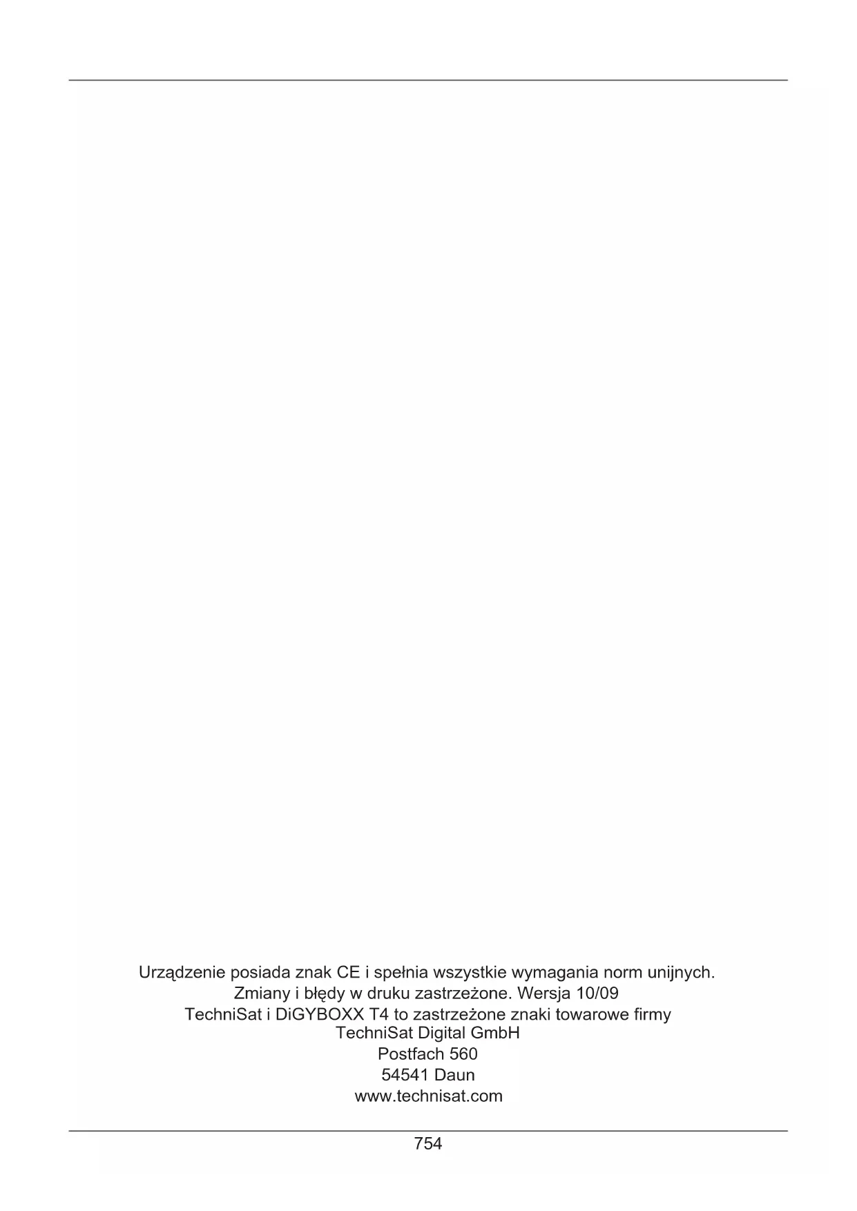 9 Pojęcia techniczne ...................................793 10 Dane techniczne .....................................795 11 Pomoc w rozwiązywaniu problemów.....................798754 Urządzenie posiada znak CE i spełnia wszystkie wymagania norm unijnych. Zmiany i błędy w druku zastrzeżone. Wersja 10/09 TechniSat i DiGYBOXX T4 to zastrzeżone znaki towarowe firmy TechniSat Digital GmbH Postfach 560 54541 Daun www.technisat.com755 2 Ilustracje niebieski Przewijanie do przodu czerwony Przewijanie wstecz żółty Pauza, odtwarzanie zielony Nawigator PVR, stop Włączanie/ Tryb czuwania Lista kanałów wł/wył Powrót Głośność + Menu wł/wył Dźwięk wł/wył Wybór języka* PIP (obraz w obrazie) Czas wyłączenia Opcja* Przy odbiorze telewizji: wybór dźwięku/napisów, funkcje specjalne Przy odbiorze radia: wybór stacji przez zmianę fali nośnej Głośność - Kanał + Kanał - Odbiór TV/radia Teletekst wł/wył* Zatrzymanie obrazu wł/wył SFI Nagrywanie Przyciski wielofunkcyjne Kanał + Głośność - Kanał - Przyciski numeryczne 0/AV