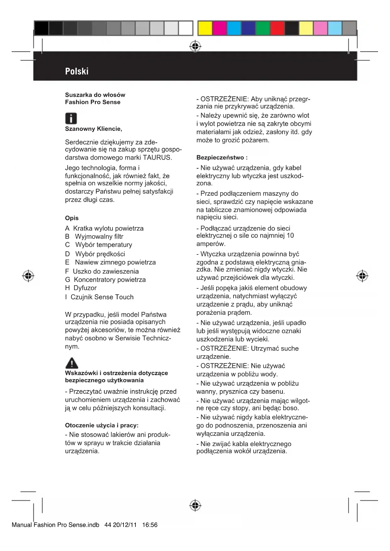 Znajdź bezpłatnie instrukcję urządzenia Fashion Pro Sense TAURUS w formacie PDF.