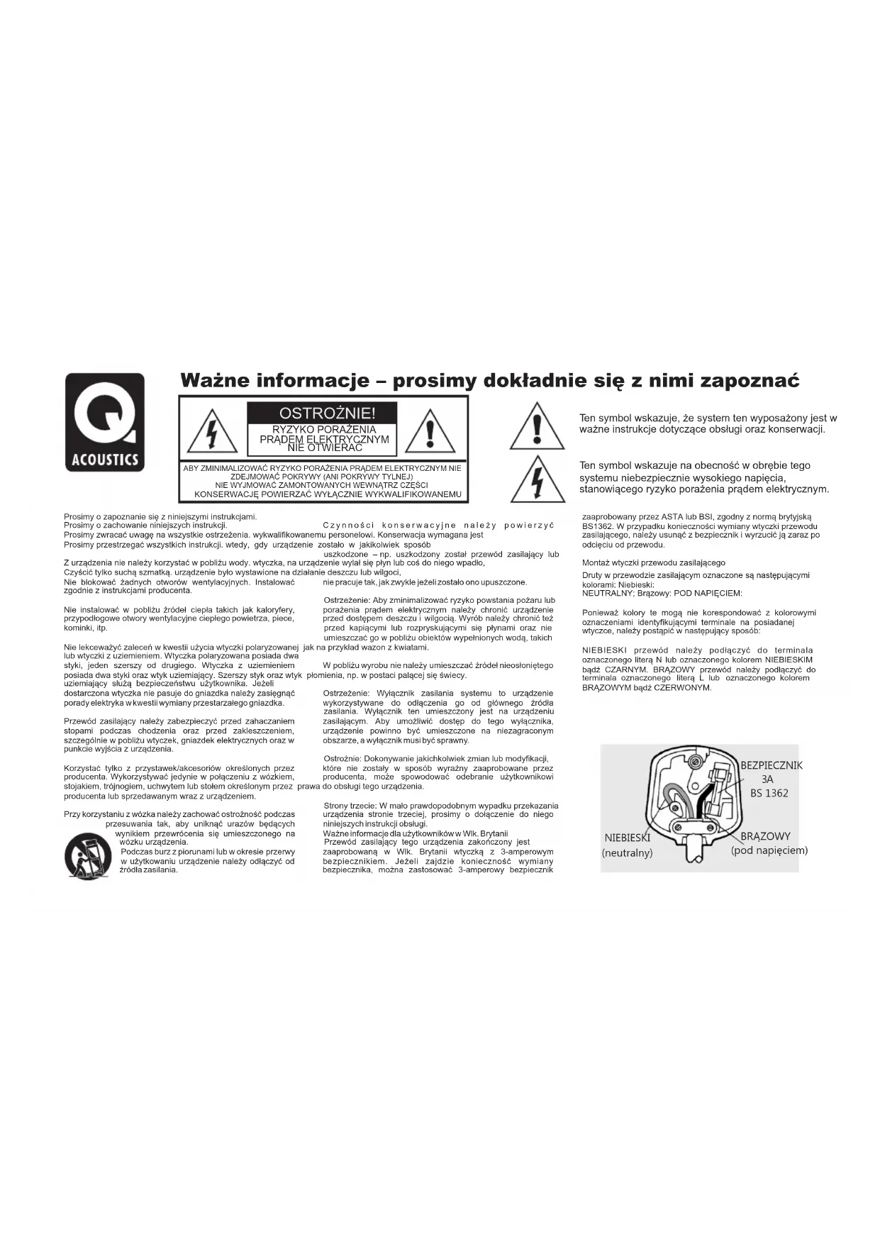 Seria 2000iProsimy o zapoznanie się z niniejszymi instrukcjami. zaaprobowany przez ASTA lub BSI, zgodny z normą brytyjską Prosimy o zachowanie niniejszych instrukcji. C z y n n o ś c i k o n s e r w a c y j n e n a l e ż y p o w i e r z y ć BS1362. W przypadku konieczności wymiany wtyczki przewodu Prosimy zwracać uwagę na wszystkie ostrzeżenia. wykwalifikowanemu personelowi. Konserwacja wymagana jest zasilającego, należy usunąć z bezpiecznik i wyrzucić ją zaraz po Prosimy przestrzegać wszystkich instrukcji. wtedy, gdy urządzenie zostało w jakikolwiek sposób odcięciu od przewodu.uszkodzone – np. uszkodzony został przewód zasilający lub Z urządzenia nie należy korzystać w pobliżu wody. wtyczka, na urządzenie wylał się płyn lub coś do niego wpadło, Montaż wtyczki przewodu zasilającegoCzyścić tylko suchą szmatką. urządzenie było wystawione na działanie deszczu lub wilgoci, Druty w przewodzie zasilającym oznaczone są następującymi Nie blokować żadnych otworów wentylacyjnych. Instalować nie pracuje tak, jak zwykle jeżeli zostało ono upuszczone. kolorami: Niebieski:zgodnie z instrukcjami producenta.NEUTRALNY; Brązowy: POD NAPIĘCIEM:Ostrzeżenie: Aby zminimalizować ryzyko powstania pożaru lub Nie instalować w pobliżu źródeł ciepła takich jak kaloryfery, porażenia prądem elektrycznym należy chronić urządzenie Ponieważ kolory te mogą nie korespondować z kolorowymi przypodłogowe otwory wentylacyjne ciepłego powietrza, piece, przed dostępem deszczu i wilgocią. Wyrób należy chronić też oznaczeniami identyfikującymi terminale na posiadanej kominki, itp. przed kapiącymi lub rozpryskującymi się płynami oraz nie wtyczce, należy postąpić w następujący sposób:umieszczać go w pobliżu obiektów wypełnionych wodą, takich Nie lekceważyć zaleceń w kwestii użycia wtyczki polaryzowanej jak na przykład wazon z kwiatami. NIEBIESKI przewód należy podłączyć do terminala lub wtyczki z uziemieniem. Wtyczka polaryzowana posiada dwa oznaczonego literą N lub oznaczonego kolorem NIEBIESKIM styki, jeden szerszy od drugiego. Wtyczka z uziemieniem W pobliżu wyrobu nie należy umieszczać źródeł nieosłoniętego bądź CZARNYM. BRĄZOWY przewód należy podłączyć do posiada dwa styki oraz wtyk uziemiający. Szerszy styk oraz wtyk płomienia, np. w postaci palącej się świecy.terminala oznaczonego literą L lub oznaczonego kolorem uziemiający służą bezpieczeństwu użytkownika. Jeżeli BRĄZOWYM bądź CZERWONYM. dostarczona wtyczka nie pasuje do gniazdka należy zasięgnąć Ostrzeżenie: Wyłącznik zasilania systemu to urządzenie porady elektryka w kwestii wymiany przestarzałego gniazdka. wykorzystywane do odłączenia go od głównego źródła zasilania. Wyłącznik ten umieszczony jest na urządzeniu Przewód zasilający należy zabezpieczyć przed zahaczaniem zasilającym. Aby umożliwić dostęp do tego wyłącznika, stopami podczas chodzenia oraz przed zakleszczeniem, urządzenie powinno być umieszczone na niezagraconym szczególnie w pobliżu wtyczek, gniazdek elektrycznych oraz w obszarze, a wyłącznik musi być sprawny. punkcie wyjścia z urządzenia.Ostrożnie: Dokonywanie jakichkolwiek zmian lub modyfikacji, Korzystać tylko z przystawek/akcesoriów określonych przez które nie zostały w sposób wyraźny zaaprobowane przez producenta. Wykorzystywać jedynie w połączeniu z wózkiem, producenta, może spowodować odebranie użytkownikowi stojakiem, trójnogiem, uchwytem lub stołem określonym przez prawa do obsługi tego urządzenia.producenta lub sprzedawanym wraz z urządzeniem.Strony trzecie: W mało prawdopodobnym wypadku przekazania Przy korzystaniu z wózka należy zachować ostrożność podczas urządzenia stronie trzeciej, prosimy o dołączenie do niego przesuwania tak, aby uniknąć urazów będących niniejszych instrukcji obsługi. wynikiem przewrócenia się umieszczonego na Ważne informacje dla użytkowników w Wlk. Brytanii wózku urządzenia. Przewód zasilający tego urządzenia zakończony jest Podczas burz z piorunami lub w okresie przerwy zaaprobowaną w Wlk. Brytanii wtyczką z 3-amperowym w użytkowaniu urządzenie należy odłączyć od bezpiecznikiem. Jeżeli zajdzie konieczność wymiany źródła zasilania. bezpiecznika, można zastosować 3-amperowy bezpiecznik OSTROŻNIE!