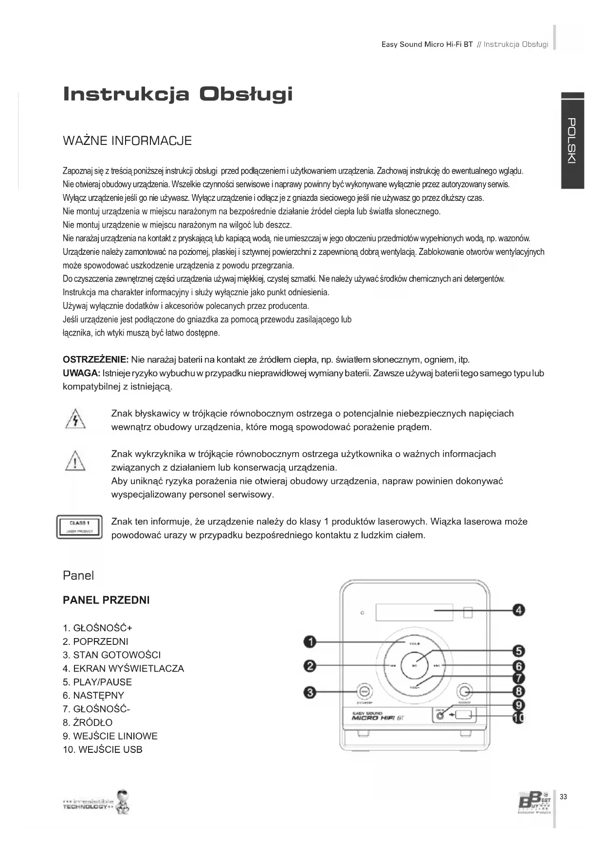 - UWAGI OGÓLNE: W żadnym przypadku firma Best Buy Internacional ani jej przedstawiciele nie biorą odpowiedzialności za szkody w postaci utraty zysków lub jakiejkolwiek innej straty pieniężnej, wynikającej z użytkowania lub braku możliwości użytkowania produktu o którym mowa, nawet w przypadku poinformowania przez Bust Buy o takiej ewentualności. Co muszę zrobić, aby móc korzystać z przywilejów Zarejestrowanego Użytkownika?Wystarczy zarejestrować się na naszej stronie: http://www.bestbuy-int.comJak mogę skontaktować się z serwisem?Po zarejestrowaniu użytkownik uzyskuje natychmiastowy kontakt z serwisem pod P O L S K I Instrukcja Obsługi // Easy Sound Micro Hi-Fi BT