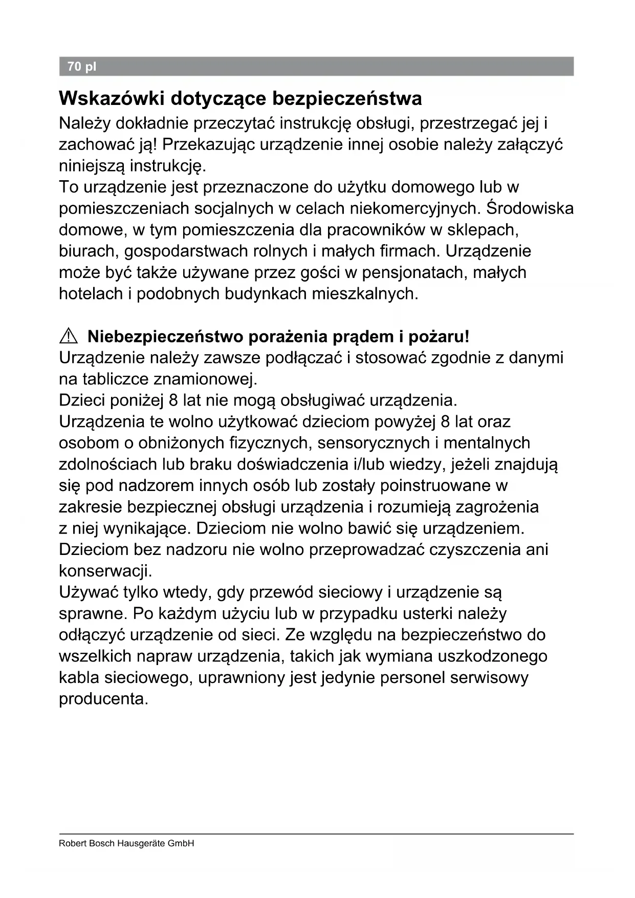 Niebezpieczeństwo porażenia prądem i pożaru! Urządzenie należy zawsze podłączać i stosować zgodnie z danymi na tabliczce znamionowej. Dzieci poniżej 8 lat nie mogą obsługiwać urządzenia. Urządzenia te wolno użytkować dzieciom powyżej 8 lat oraz osobom o obniżonych zycznych, sensorycznych i mentalnych zdolnościach lub braku doświadczenia i/lub wiedzy, jeżeli znajdują się pod nadzorem innych osób lub zostały poinstruowane w zakresie bezpiecznej obsługi urządzenia i rozumieją zagrożenia z niej wynikające. Dzieciom nie wolno bawić się urządzeniem. Dzieciom bez nadzoru nie wolno przeprowadzać czyszczenia ani konserwacji. Używać tylko wtedy, gdy przewód sieciowy i urządzenie są sprawne. Po każdym użyciu lub w przypadku usterki należy odłączyć urządzenie od sieci. Ze względu na bezpieczeństwo do wszelkich napraw urządzenia, takich jak wymiana uszkodzonego kabla sieciowego, uprawniony jest jedynie personel serwisowy producenta.71 PHC 9790 02/2013 71pl Kabla sieciowego nie wolno ● dotykać gorącymi elementami, ● prowadzić po ostrych krawędziach, ● stosować jako uchwytu do przenoszenia urządzenia. Przed rozpoczęciem czyszczenia należy odłączyć urządzenie od sieci. Nigdy nie zanurzać urządzenia w wodzie. Nie stosować urządzeń do czyszczenia parą. Element grzejny jest bardzo gorący. Urządzenie należy trzymać tylko za uchwyt. Stosować wyłącznie na suchych włosach. Nie wolno stosować na sztucznych włosach. Urządzenie należy umieszczać wyłącznie na powierzchniach odpornych na działanie wysokiej temperatury. Nie stosować w pobliżu wanien, umywalek lub innych zbiorników napełnionych wodą.