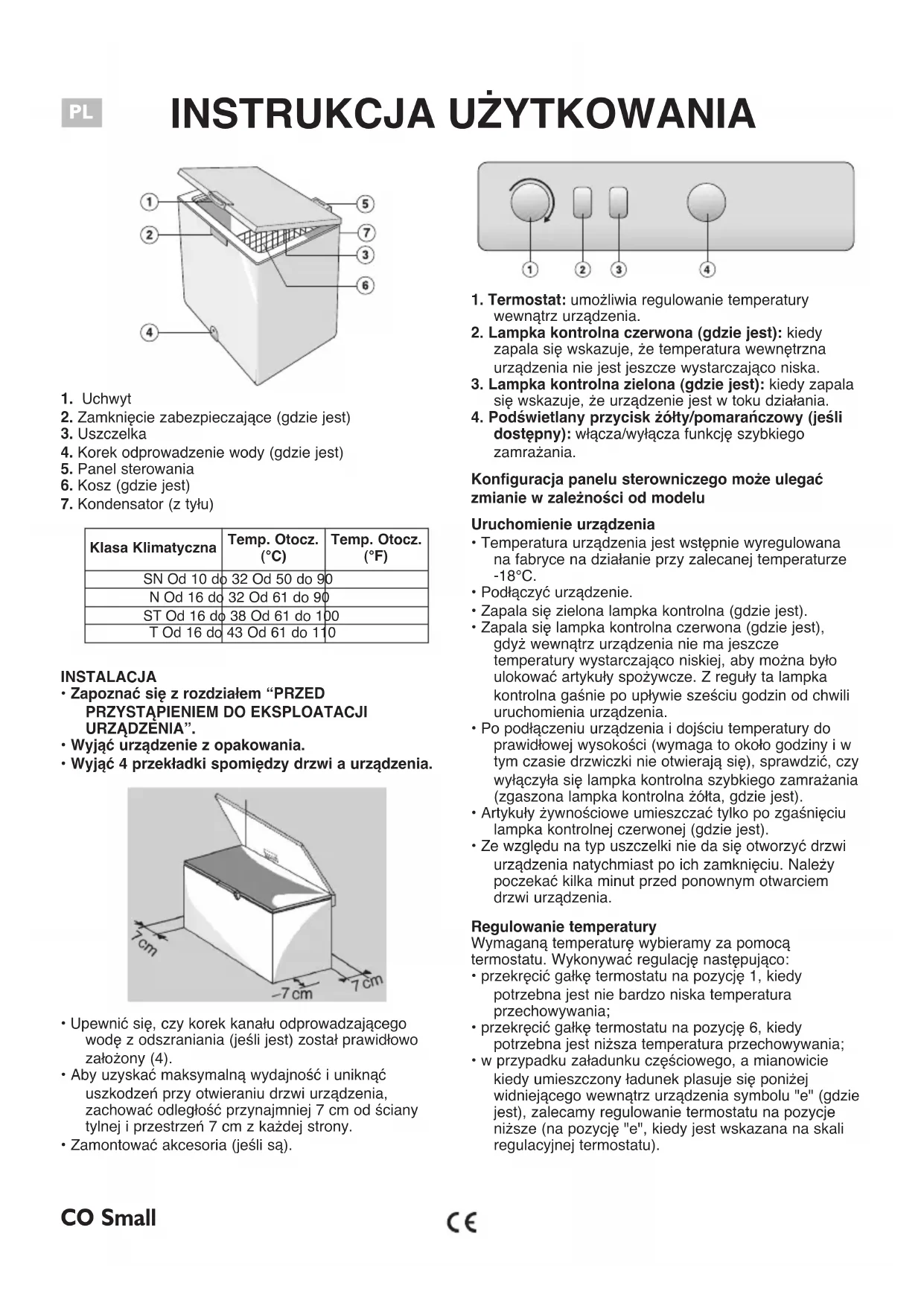 - w przypadku załadunku częściowego, a mianowicie kiedy umieszczony ładunek plasuje się poniżej widniejącego wewnątrz urządzenia symbolu "e" (gdzie jest), zalecamy regulowanie termostatu na pozycje niższe (na pozycję "e", kiedy jest wskazana na skali regulacyjnej termostatu). Klasa Klimatyczna Temp. Otocz. (°C) Temp. Otocz. (°F) SN Od 10 do 32 Od 50 do 90 N Od 16 do 32 Od 61 do 90 ST Od 16 do 38 Od 61 do 100 T Od 16 do 43 Od 61 do 110 CO SmallINSTRUKCJA UŻYTKOWANIA azPRZED PRZYSTĄPIENIEM DO EKSPLOATACJI URZĄDZENIA Urządzenie, które Państwo zakupili, jest przeznaczone wyłącznie do użytku domowego i służy do przechowywania zamrożonych środków spożywczych, mrożenia świeżej żywności i produkcji lodu. Uziemienie urządzenia jest obowiązkowe, zgodnie z przepisami prawa. Producent nie ponosi żadnej odpowiedzialności z tytułu ewentualnych szkód wyrządzonych osobom, zwierzętom lub strat materialnych wynikających z nieprzestrzegania tych instrukcji.