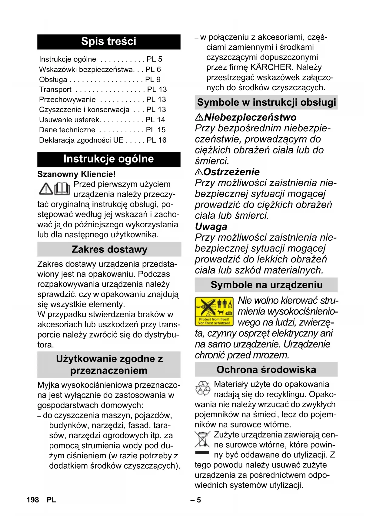 90 dB(A) Pridržana pravica do tehničnih sprememb! ES-izjava o skladnosti Proizvod: visokotlačni čistilec Tip: 1.601-xxx Zadevne ES-direktive: 2006/42/ES (+2009/127/ES) 2004/108/ES 2011/65/ЕU 2000/14/ES Uporabljene usklajene norme: EN 50581 EN 55014–1: 2006+A1: 2009+A2: 2011 EN 55014–2: 1997+A1: 2001+A2: 2008 EN 60335–1 EN 60335–2–79 EN 61000–3–2: 2006+A1: 2009+A2: 2009 EN 61000–3–3: 2008 EN 62233: 2008 Postopek ocenjevanja skladnosti: 2000/14/ES: Priloga V Raven zvočne moči dB(A) Izmerjeno: 87 Zajamčeno: 90 Winnenden, 2013/07/01 CEO Head of Approbation 197SL– 5 Szanowny Kliencie! Przed pierwszym użyciem urządzenia należy przeczy- tać oryginalną instrukcję obsługi, po- stępować według jej wskazań i zacho- wać ją do późniejszego wykorzystania lub dla następnego użytkownika. Zakres dostawy urządzenia przedsta- wiony jest na opakowaniu. Podczas rozpakowywania urządzenia należy sprawdzić, czy w opakowaniu znajdują się wszystkie elementy. W przypadku stwierdzenia braków w akcesoriach lub uszkodzeń przy trans- porcie należy zwrócić się do dystrybu- tora. Myjka wysokociśnieniowa przeznaczo- na jest wyłącznie do zastosowania w gospodarstwach domowych: – do czyszczenia maszyn, pojazdów, budynków, narzędzi, fasad, tara- sów, narzędzi ogrodowych itp. za pomocą strumienia wody pod du- żym ciśnieniem (w razie potrzeby z dodatkiem środków czyszczących), – w połączeniu z akcesoriami, częś- ciami zamiennymi i środkami czyszczącymi dopuszczonymi przez firmę KÄRCHER. Należy przestrzegać wskazówek załączo- nych do środków czyszczących. Niebezpieczeństwo Przy bezpośrednim niebezpie- czeństwie, prowadzącym do ciężkich obrażeń ciała lub do śmierci. 몇 Ostrzeżenie Przy możliwości zaistnienia nie- bezpiecznej sytuacji mogącej prowadzić do ciężkich obrażeń ciała lub śmierci. Uwaga Przy możliwości zaistnienia nie- bezpiecznej sytuacji mogącej prowadzić do lekkich obrażeń ciała lub szkód materialnych. Nie wolno kierować stru- mienia wysokociśnienio- wego na ludzi, zwierzę- ta, czynny osprzęt elektryczny ani na samo urządzenie. Urządzenie chronić przed mrozem. Materiały użyte do opakowania nadają się do recyklingu. Opako- wania nie należy wrzucać do zwykłych pojemników na śmieci, lecz do pojem- ników na surowce wtórne. Zużyte urządzenia zawierają cen- ne surowce wtórne, które powin- ny być oddawane do utylizacji. Z tego powodu należy usuwać zużyte urządzenia za pośrednictwem odpo- wiednich systemów utylizacji. Spis treści Instrukcje ogólne . . . . . . . . . . . PL 5 Wskazówki bezpieczeństwa. . . PL 6 Obsługa . . . . . . . . . . . . . . . . . . PL 9 Transport . . . . . . . . . . . . . . . . . PL 13 Przechowywanie . . . . . . . . . . . PL 13 Czyszczenie i konserwacja . . . PL 13 Usuwanie usterek. . . . . . . . . . . PL 14 Dane techniczne . . . . . . . . . . . PL 15 Deklaracja zgodności UE . . . . . PL 16 Instrukcje ogólne Zakres dostawy Użytkowanie zgodne z przeznaczeniem Symbole w instrukcji obsługi Symbole na urządzeniu Ochrona środowiska 198 PL– 6 Wskazówki dotyczące składników (REACH) Aktualne informacje dotyczące skład- ników znajdują się pod: www.kaercher.com/REACH W każdym kraju obowiązują warunki gwarancji określone przez odpowied- niego lokalnego dystrybutora. Ewentu- alne usterki urządzenia usuwane są w okresie gwarancji bezpłatnie, o ile spo- wodowane są błędem materiałowym lub produkcyjnym. W sprawach na- praw gwarancyjnych prosimy kierować się z dowodem zakupu do dystrybutora lub do autoryzowanego punktu serwi- sowego. (Adres znajduje się na odwrocie) Niebezpieczeństwo Nigdy nie dotykać wtyczki ani gniazdka mokrymi rękami. Nie uruchamiać urządzenia w przypadku uszkodzenia prze- wodu zasilającego lub waż- nych części urządzenia, np. przewodu ciśnieniowego, pi- stoletu natryskowego lub ele- mentów zabezpieczających. Przed każdym zastosowa- niem sprawdzać, czy prze- wód zasilający lub wtyczka nie są uszkodzone. W przy- padku uszkodzenia przewo- du zasilającego niezwłocznie zlecić jego wymianę przez autoryzowany serwis lub elektryka. Przed każdym użyciem sprawdzać, czy przewód ciś- nieniowy nie jest uszkodzony. Uszkodzony przewód ciśnie- niowy należy niezwłocznie wymienić. Eksploatacja urządzenia w miejscach zagrożonych wy- buchem jest zabroniona. Podczas użytkowania w ob- szarach zagrożonych (np. na stacjach benzynowych) nale- ży przestrzegać stosownych przepisów bezpieczeństwa. W przypadku niewłaściwego użycia strumień wody pod ciśnieniem może być niebez- pieczny. Nie wolno kierować strumienia na ludzi, zwierzę- ta, czynny osprzęt elektrycz- ny ani na samo urządzenie. Przy czyszczeniu odzieży lub obuwia nie kierować strumie- nia na siebie ani na inne osoby. Nie czyścić strumieniem przedmiotów zawierających materiały szkodliwe dla zdro- wia (np. azbest). Strumień wody pod ciśnie- niem może uszkodzić wenty- le lub opony samochodowe i doprowadzić do pęknięcia opony. Pierwszym sygnałem takiego niebezpieczeństwa jest przebarwienie opony. Uszkodzone opony samo- chodowe i wentyle stanowią zagrożenie dla życia. Pod- czas czyszczenia zachować odległość strumienia mini- mum 30 cm! Gwarancja Wskazówki bezpieczeństwa 199PL– 7