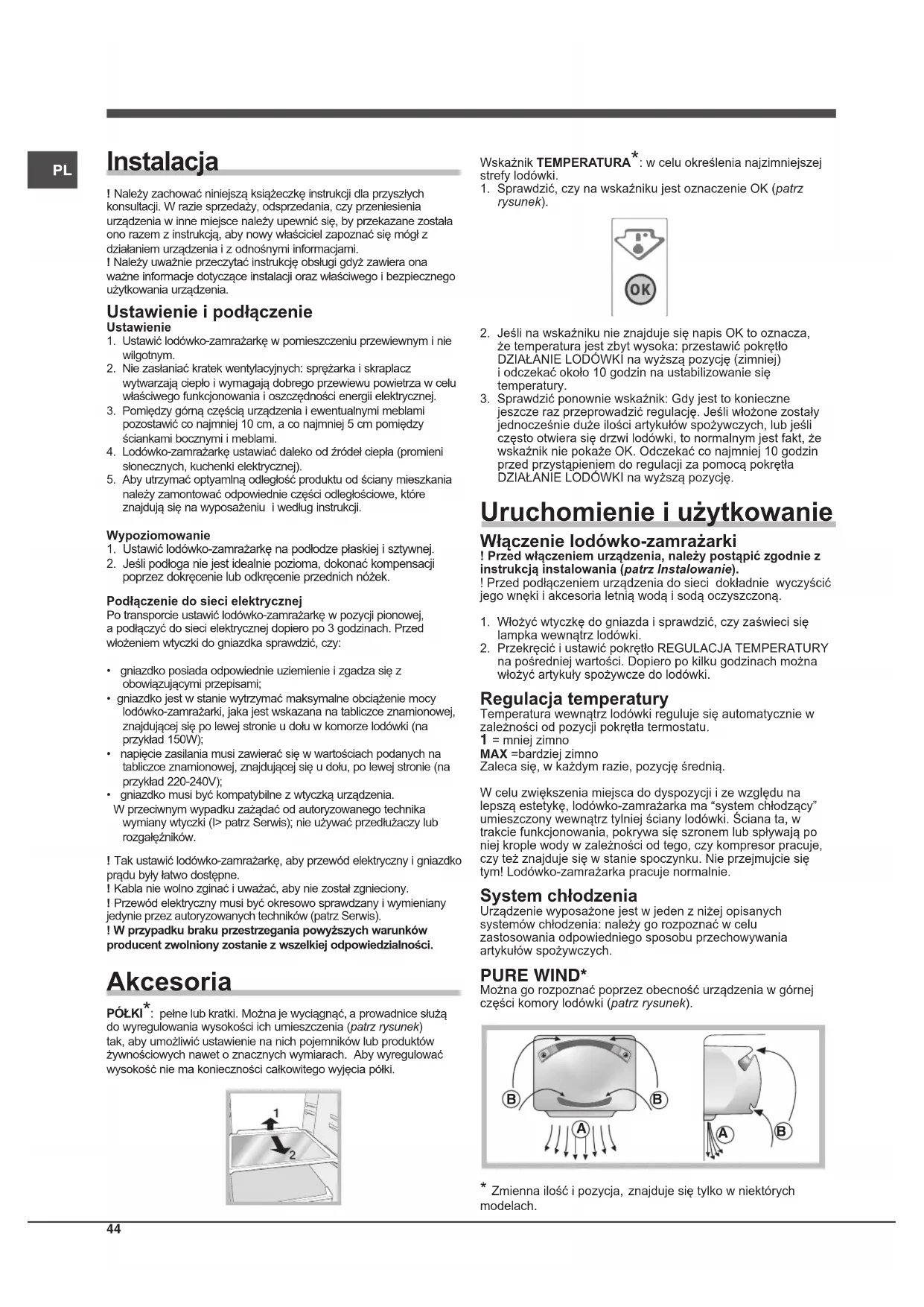Instalacja ! Należy zachować niniejszą książeczkę instrukcji dla przyszłych konsultacji. W razie sprzedaży, odsprzedania, czy przeniesienia urządzenia w inne miejsce należy upewnić się, by przekazane została ono razem z instrukcją, aby nowy właściciel zapoznać się mógł z działaniem urządzenia i z odnośnymi informacjami.! Należy uważnie przeczytać instrukcję obsługi gdyż zawiera ona ważne informacje dotyczące instalacji oraz właściwego i bezpiecznego użytkowania urządzenia. Ustawienie i podłączenie Ustawienie1. Ustawić lodówko-zamrażarkę w pomieszczeniu przewiewnym i nie wilgotnym.2. Nie zasłaniać kratek wentylacyjnych: sprężarka i skraplacz wytwarzają ciepło i wymagają dobrego przewiewu powietrza w celu właściwego funkcjonowania i oszczędności energii elektrycznej.3. Pomiędzy górną częścią urządzenia i ewentualnymi meblami pozostawić co najmniej 10 cm, a co najmniej 5 cm pomiędzy ściankami bocznymi i meblami.4. Lodówko-zamrażarkę ustawiać daleko od źródeł ciepła (promieni słonecznych, kuchenki elektrycznej).5. Aby utrzymać optyamlną odległość produktu od ściany mieszkania należy zamontować odpowiednie części odległościowe, które znajdują się na wyposażeniu i według instrukcji.Wypoziomowanie1. Ustawić lodówko-zamrażarkę na podłodze płaskiej i sztywnej.2. Jeśli podłoga nie jest idealnie pozioma, dokonać kompensacji poprzez dokręcenie lub odkręcenie przednich nóżek.Podłączenie do sieci elektrycznejPo transporcie ustawić lodówko-zamrażarkę w pozycji pionowej, a podłączyć do sieci elektrycznej dopiero po 3 godzinach. Przed włożeniem wtyczki do gniazdka sprawdzić, czy:• gniazdko posiada odpowiednie uziemienie i zgadza się z obowiązującymi przepisami;• gniazdko jest w stanie wytrzymać maksymalne obciążenie mocy lodówko-zamrażarki, jaka jest wskazana na tabliczce znamionowej, znajdującej się po lewej stronie u dołu w komorze lodówki (na przykład 150W);• napięcie zasilania musi zawierać się w wartościach podanych na tabliczce znamionowej, znajdującej się u dołu, po lewej stronie (na przykład 220-240V);• gniazdko musi być kompatybilne z wtyczką urządzenia. W przeciwnym wypadku zażądać od autoryzowanego technika wymiany wtyczki (I> patrz Serwis); nie używać przedłużaczy lub rozgałęźników.! Tak ustawić lodówko-zamrażarkę, aby przewód elektryczny i gniazdko prądu były łatwo dostępne.! Kabla nie wolno zginać i uważać, aby nie został zgnieciony.! Przewód elektryczny musi być okresowo sprawdzany i wymieniany jedynie przez autoryzowanych techników (patrz Serwis).! W przypadku braku przestrzegania powyższych warunków producent zwolniony zostanie z wszelkiej odpowiedzialności. Akcesoria PÓŁKI*: pełne lub kratki. Można je wyciągnąć, a prowadnice służą do wyregulowania wysokości ich umieszczenia (patrz rysunek) tak, aby umożliwić ustawienie na nich pojemników lub produktów żywnościowych nawet o znacznych wymiarach. Aby wyregulować wysokość nie ma konieczności całkowitego wyjęcia półki. Wskaźnik TEMPERATURA*: w celu określenia najzimniejszej strefy lodówki.1. Sprawdzić, czy na wskaźniku jest oznaczenie OK (patrz rysunek).2. Jeśli na wskaźniku nie znajduje się napis OK to oznacza, że temperatura jest zbyt wysoka: przestawić pokrętło DZIAŁANIE LODÓWKI na wyższą pozycję (zimniej) i odczekać około 10 godzin na ustabilizowanie się temperatury.3. Sprawdzić ponownie wskaźnik: Gdy jest to konieczne jeszcze raz przeprowadzić regulację. Jeśli włożone zostały jednocześnie duże ilości artykułów spożywczych, lub jeśli często otwiera się drzwi lodówki, to normalnym jest fakt, że wskaźnik nie pokaże OK. Odczekać co najmniej 10 godzin przed przystąpieniem do regulacji za pomocą pokrętła DZIAŁANIE LODÓWKI na wyższą pozycję. Uruchomienie i użytkowanie Włączenie lodówko-zamrażarki ! Przed włączeniem urządzenia, należy postąpić zgodnie z instrukcją instalowania (patrz Instalowanie).! Przed podłączeniem urządzenia do sieci dokładnie wyczyścić jego wnęki i akcesoria letnią wodą i sodą oczyszczoną.1. Włożyć wtyczkę do gniazda i sprawdzić, czy zaświeci się lampka wewnątrz lodówki.2. Przekręcić i ustawić pokrętło REGULACJA TEMPERATURY na pośredniej wartości. Dopiero po kilku godzinach można włożyć artykuły spożywcze do lodówki. Regulacja temperatury Temperatura wewnątrz lodówki reguluje się automatycznie w zależności od pozycji pokrętła termostatu. 1 = mniej zimno MAX =bardziej zimnoZaleca się, w każdym razie, pozycję średnią.W celu zwiększenia miejsca do dyspozycji i ze względu na lepszą estetykę, lodówko-zamrażarka ma “system chłodzący” umieszczony wewnątrz tylniej ściany lodówki. Ściana ta, w trakcie funkcjonowania, pokrywa się szronem lub spływają po niej krople wody w zależności od tego, czy kompresor pracuje, czy też znajduje się w stanie spoczynku. Nie przejmujcie się tym! Lodówko-zamrażarka pracuje normalnie. System chłodzenia Urządzenie wyposażone jest w jeden z niżej opisanych systemów chłodzenia: należy go rozpoznać w celu zastosowania odpowiedniego sposobu przechowywania artykułów spożywczych. PURE WIND* Można go rozpoznać poprzez obecność urządzenia w górnej części komory lodówki (patrz rysunek).