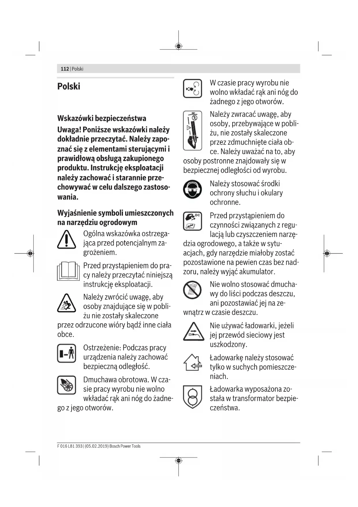 2000/14/EC: Ölçülen ses gücü seviyesi 90dB(A), tolerans K = 1,0dB, garanti edilen ses gücü seviyesi 91dB(A) Uygunluk değerlendirme yöntemi ek V uyarınca. Ürün kategorisi: 34 Teknik belgelerin bulunduğu yer: pl 2000/14/WE: pomierzony poziom mocy akustycznej 90dB(A), niepewność K = 1,0dB, gwarantowany poziom mocy akustycznej 91dB(A) F 016 L81 393 | (05.02.2019) Bosch Power ToolsV Procedura oceny zgodności zgodnie z załącznikiem V. Kategoria produktów: 34 Dokumentacja techniczna: *