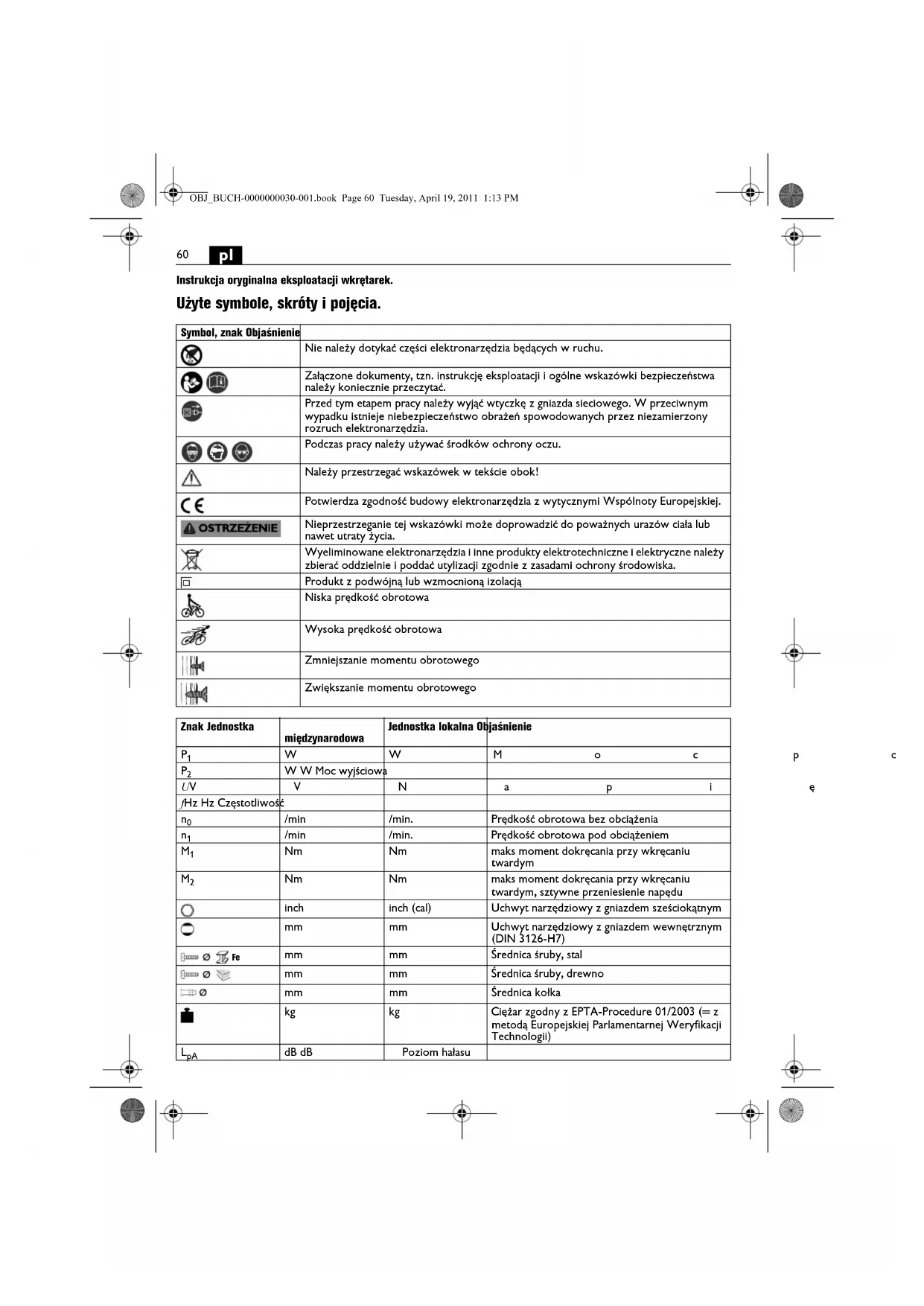 Instrukcja oryginalna eksploatacji wkrętarek. Użyte symbole, skróty i pojęcia. Symbol, znak Objaśnienie Nie należy dotykać części elektronarzędzia będących w ruchu. Załączone dokumenty, tzn. instrukcję eksploatacji i ogólne wskazówki bezpieczeństwa należy koniecznie przeczytać. Przed tym etapem pracy należy wyjąć wtyczkę z gniazda sieciowego. W przeciwnym wypadku istnieje niebezpieczeństwo obrażeń spowodowanych przez niezamierzony rozruch elektronarzędzia. Podczas pracy należy używać środków ochrony oczu. Należy przestrzegać wskazówek w tekście obok! Potwierdza zgodność budowy elektronarzędzia z wytycznymi Wspólnoty Europejskiej. Nieprzestrzeganie tej wskazówki może doprowadzić do poważnych urazów ciała lub nawet utraty życia. Wyeliminowane elektronarzędzia i inne produkty elektrotechniczne i elektryczne należy zbierać oddzielnie i poddać utylizacji zgodnie z zasadami ochrony środowiska. Produkt z podwójną lub wzmocnioną izolacją Niska prędkość obrotowa Wysoka prędkość obrotowa Zmniejszanie momentu obrotowego Zwiększanie momentu obrotowego Znak Jednostka międzynarodowa Jednostka lokalna Objaśnienie