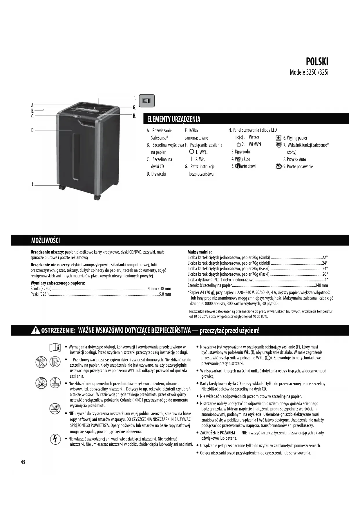 Niszczarki Fellowes SafeSense® są przeznaczone do pracy w warunkach biurowych, w zakresie temperatur od 10 do 26°C i przy wilgotności względnej od 40 do 80%. ВОЗМОЖНОСТИ