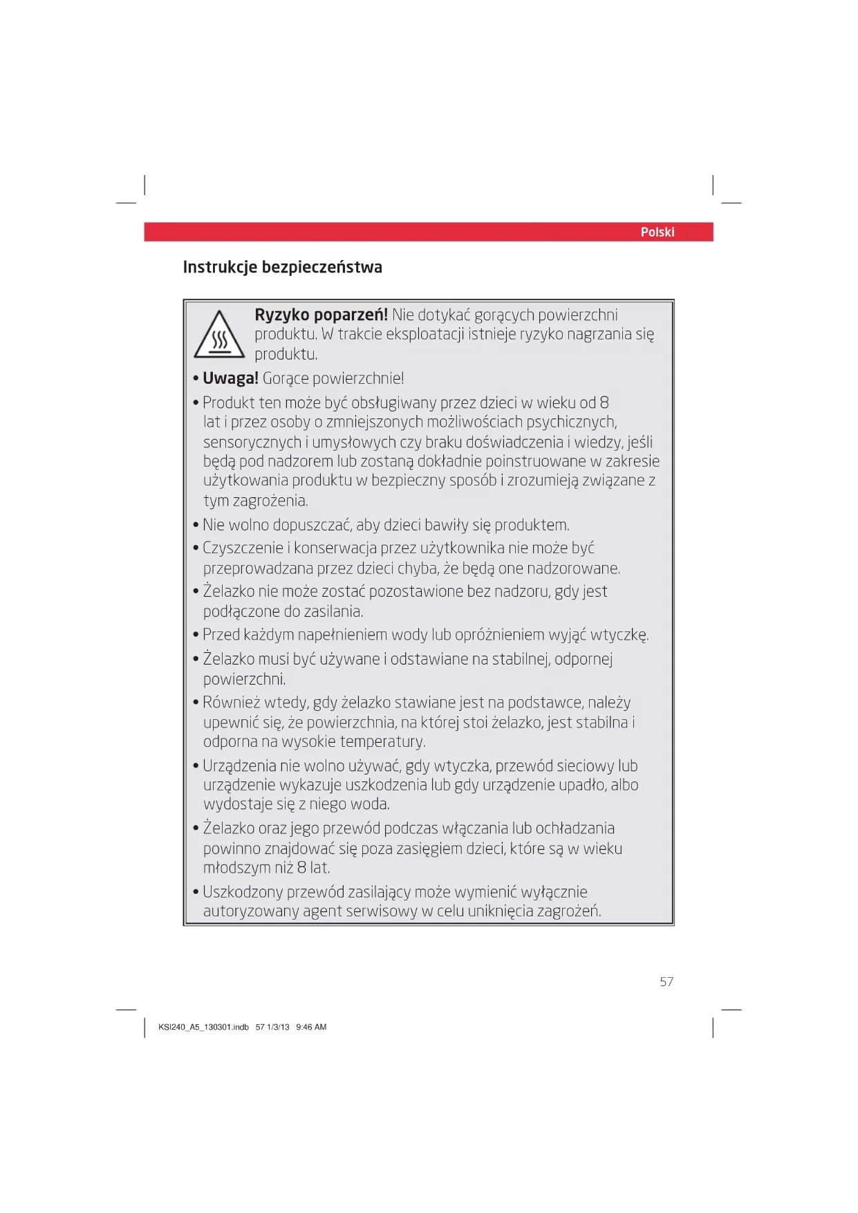Instrukcje bezpieczeństwa Ryzyko poparzeń! Nie dotykać gorących powierzchni produktu. W trakcie eksploatacji istnieje ryzyko nagrzania się produktu. ŒUwaga! Gorące powierzchnie! ŒProdukt ten może być obsługiwany przez dzieci w wieku od 8 lat i przez osoby o zmniejszonych możliwościach psychicznych, sensorycznych i umysłowych czy braku doświadczenia i wiedzy, jeśli będą pod nadzorem lub zostaną dokładnie poinstruowane w zakresie użytkowania produktu w bezpieczny sposób i zrozumieją związane z tym zagrożenia. ŒNie wolno dopuszczać, aby dzieci bawiły się produktem. ŒCzyszczenie i konserwacja przez użytkownika nie może być przeprowadzana przez dzieci chyba, że będą one nadzorowane. ŒŻelazko nie może zostać pozostawione bez nadzoru, gdy jest podłączone do zasilania. ŒPrzed każdym napełnieniem wody lub opróżnieniem wyjąć wtyczkę. ŒŻelazko musi być używane i odstawiane na stabilnej, odpornej powierzchni. ŒRównież wtedy, gdy żelazko stawiane jest na podstawce, należy upewnić się, że powierzchnia, na której stoi żelazko, jest stabilna i odporna na wysokie temperatury. ŒUrządzenia nie wolno używać, gdy wtyczka, przewód sieciowy lub urządzenie wykazuje uszkodzenia lub gdy urządzenie upadło, albo wydostaje się z niego woda. ŒŻelazko oraz jego przewód podczas włączania lub ochładzania powinno znajdować się poza zasięgiem dzieci, które są w wieku młodszym niż 8 lat. ŒUszkodzony przewód zasilający może wymienić wyłącznie autoryzowany agent serwisowy w celu uniknięcia zagrożeń. KSI240_A5_130301.indb 57 1/3/13 9:46 AMPolski