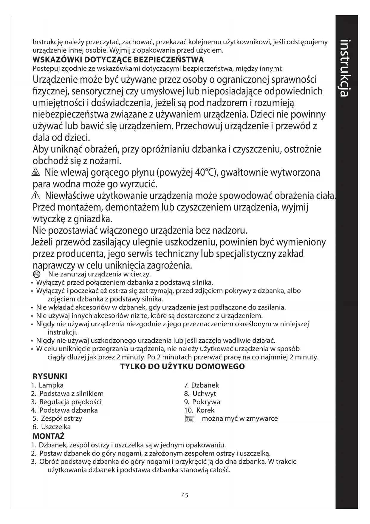 • Nie wkładać akcesoriów w dzbanek, gdy urządzenie jest podłączone do zasilania.