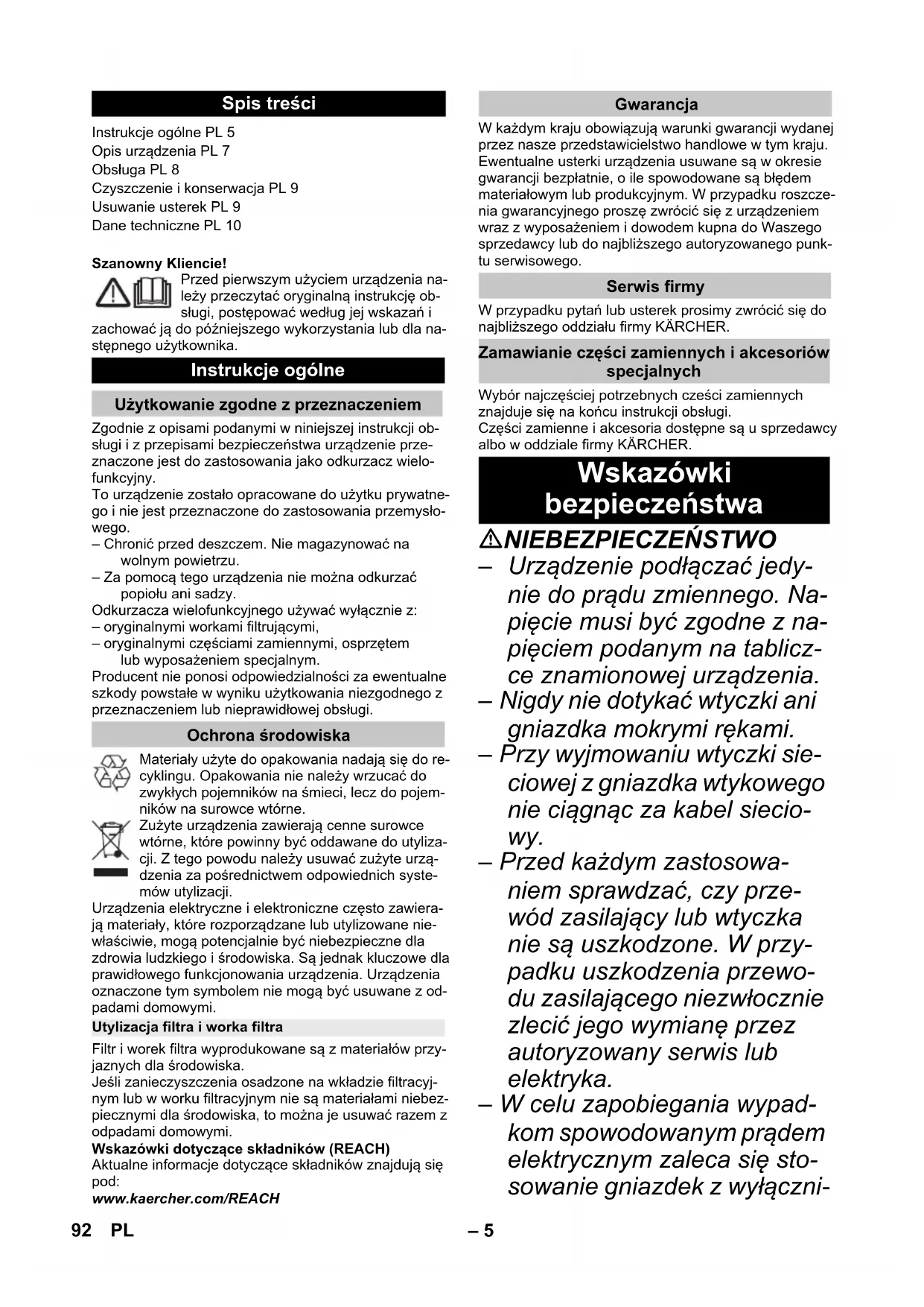 Hmotnost (bez příslušenství) 86 CS– 5 Spoštovani kupec, Pred prvo uporabo Vaše naprave preberi- te to originalno navodilo za uporabo, rav- najte se po njem in shranite ga za morebi- tno kasnejšo uporabo ali za naslednjega lastnika. Naprava je v skladu z opisom in varnostnimi napotki v tem navodilu za uporabo namenjena za uporabo kot večnamenski sesalnik. Ta naprava je razvita za privatno uporabo in ne izpolnju- je zahtev za uporabo v industriji. – Napravo zaščitite pred dežjem. Ne hranite je na od- prtem. – S to napravo se ne sme sesati pepela in saj. Večnamenski sesalnik uporabljajte le z: – originalno filtrsko vrečko. – originalnimi nadomestnimi deli, originalnim pribo- rom ali specialnim priborom. Proizvajalec ne odgovarja za morebitno škodo, ki je na- stala zaradi nenamenske uporabe ali napačnega roko- vanja. Embalažo je mogoče reciklirati. Prosimo, da em- balaže ne odlagate med gospodinjski odpad, pač pa jo oddajte v ponovno predelavo. Stare naprave vsebujejo pomembne materiale, ki so namenjeni za nadaljnjo predelavo. Zato stare naprave zavrzite s pomočjo ustreznih zbi- ralnih sistemov. Filtri in filtrske vrečke so izdelani iz okolju prijaznih ma- terialov. V kolikor ne vsebujejo snovi, ki so v gospodinjskih od- padkih prepovedane, jih lahko odvržete v običajen go- spodinjski odpad. Opozorila k sestavinam (REACH) Aktualne informacije o sestavinah najdete na: www.kaercher.com/REACH V vseh deželah veljajo garantni pogoji, ki jih definirajo pripadajoča predstavništva proizvajalca. Morebitne ne- pravilnosti na napravi, ki se pojavijo zaradi materialnih oziroma proizvodnih napak, nadomestimo v garantnem času brezplačno. V primeru, da se naprava pokvari, se z originalnim računom in pripadajočim priborom oglasite pri prodajalcu oziroma pri najbližji pooblaščeni servisni službi. V primeru vprašanj ali motenj se obrnite na našo KÄR- CHER podružnico. Izbor najpogosteje potrebnih nadomestnih delov najde- te na koncu navodila za obratovanje. Nadomestne dele in pribor dobite pri svojem trgovcu ali pri podružnici podj. KÄRCHER. NEVARNOST – Stroj priključujte samo na iz- menični tok. Napetost se mora ujemati s tipsko plošči- co stroja. – Omrežnega vtiča in vtičnice nikoli ne prijemajte z mokrimi rokami. – Omrežnega vtiča ne vlecite iz vtičnice z vlečenjem priključ- nega kabla. – Pred vsako uporabo preverite ali na priključnem kablu z omrežnim vitčem obstajajo poškodbe. Poškodovani pri- ključni kabel takoj dajte na za- menjavo pooblaščeni servisni službi/električarju. – Za izogibanje električnim ne- srečam priporočamo, da upo- rabljate vtičnice s predvklo- pljenim zaščitnim stikalom (maks. 30 mA nazivne jakosti sprožilnega toka). – Pred vsemi čistilnimi in vzdr- ževalnimi deli izklopite napra- vo in omrežni vtič izvlecite iz vtičnice. – Popravila in posege na elek- tričnih sestavnih delih sme opravljati le pooblaščena ser- visna služba. Vsebinsko kazalo Splošna navodila SL 5 Opis naprave SL 7 Uporaba SL 8 Vzdrževanje SL 9 Pomoč pri motnjah SL 9 Tehnični podatki SL 9 Splošna navodila Namenska uporaba Varstvo okolja Odstranitev filtrov in filtrskih vrečk Garancija Uporabniški servis Naročanje nadomestnih delov in posebnega pribora Varnostna navodila 87SL– 6 OPOZORILO – Ta naprava ni namenjena uporabi oseb z omejenimi fi- zičnimi, senzoričnimi ali du- ševnimi sposobnostmi ali po- manjkljivimi izkušnjami in/ali pomanjkljivim znanjem, razen če jih nadzoruje oseba, pri- stojna za njihovo varnost, ali so od nje prejeli navodila, kako napravo uporabljati, ter so razumeli nevarnosti, ki iz tega izhajajo. – Otroci smejo napravo upora- bljati le, če so stari nad 8 let in jih nadzoruje oseba, pristojna za njihovo varnost, ali so od nje prejeli navodila, kako na- pravo uporabljati, ter so razu- meli nevarnosti, ki iz tega iz- hajajo. – Otroci se z napravo ne smejo igrati. – Nadzorujte otroke, da zagoto- vite, da se z napravo ne igra- jo. – Čiščenja in uporabniškega vzdrževanja otroci ne smejo izvajati brez nadzora. – Embalažne folije hranite proč od otrok, obstaja nevarnost zadušitve! – Napravo izklopite po vsaki uporabi ter pred vsakim či- ščenjem/vzdrževanjem. – Nevarnost požara. Ne sesajte gorečih ali tlilnih predmetov. – Prepovedano je obratovanje v področjih, kjer obstaja ne- varnost eksplozij. – Pri penjenju ali iztekanju te- kočine aparat takoj izklopite ali izvlecite omrežni vtič! – Ne uporabljajte sredstev za poliranje, čiščenje stekla ali večnamenskih čistil! Naprave nikoli ne potapljajte pod vo- dno gladino. Določene snovi lahko pri vrtinče- nju s sesalnim zrakom tvorijo ek- splozivne pare ali mešanice! Sledečih snovi nikoli ne vsesa- vajte: – eksplozivne ali vnetljive pline, tekočine in prah (reaktivni prah) – reaktivni kovinski prah (npr. aluminij, magnezij, cink) v po- vezavi z močno alkalnimi in kislimi čistilnimi sredstvi – nerazredčene mo čne kisline in lug – organska topila (npr. bencin, barvno razredčilo, aceton, ku- rilno olje). Te snovi lahko dodatno uničuje- jo materiale uporabljene na stro- ju. NEVARNOST Opozorilo na neposredno nevar- nost, ki vodi do težkih telesnih poškodb ali smrti. 몇 OPOZORILO Opozorilo na možno nevarno si- tuacijo, ki lahko vodi do težkih telesnih poškodb ali smrti. 몇 PREVIDNOST Opozorilo na možno nevarno si- tuacijo, ki lahko vodi do lažjih poškodb. Stopnje nevarnosti 88 SL– 7 POZOR Opozorilo na možno nevarno si- tuacijo, ki lahko vodi do premo- ženjskih škod. Slike glejte na razklopni strani! To navodilo za uporabo opisuje več- namenski sesalnik, naveden na sprednjem ovitku. Slike kažejo maksimalno opremljenost, glede na model obstajajo razlike v opremi in priloženem pri- boru. Pri razpakiranju preverite ali v vsebini paketa manjka pribor oz. ali obstajajo poškodbe. V primeru transportnih poškodb obvestite svojega prodajalca. vsebovano v obsegu dobave možen pribor