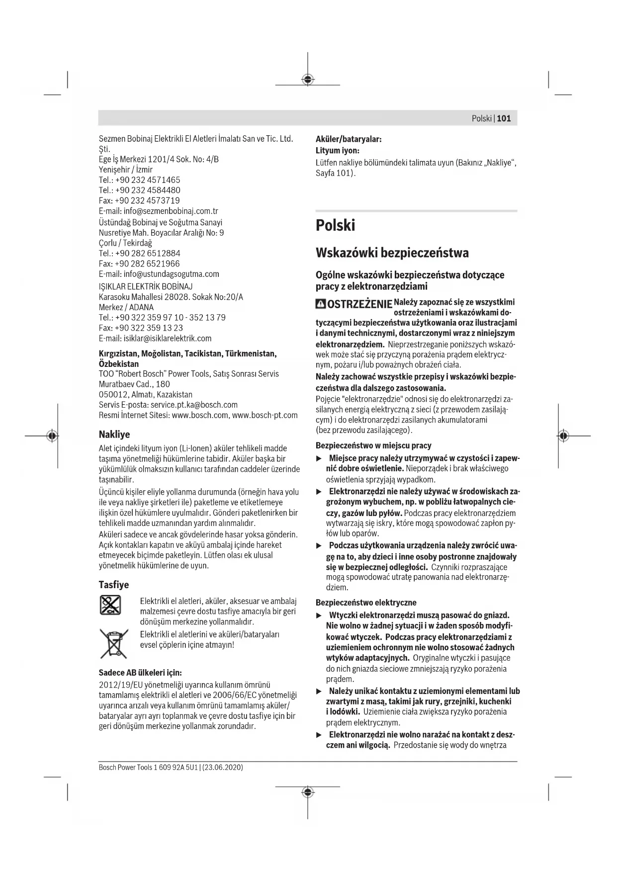 prądem elektrycznym. u Elektronarzędzi nie wolno narażać na kontakt z desz- czem ani wilgocią. Przedostanie się wody do wnętrza Bosch Power Tools 1 609 92A 5U1 | (23.06.2020)102 | Polski