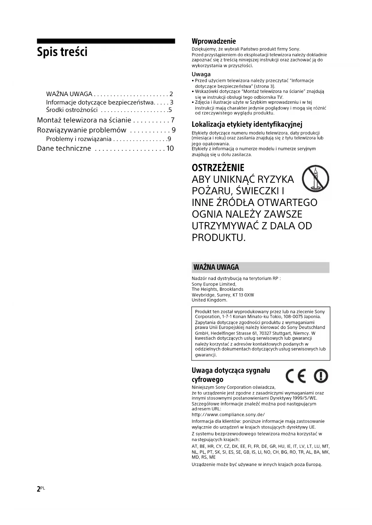 cyfrowego Niniejszym Sony Corporation oświadcza, że to urządzenie jest zgodne z zasadniczymi wymaganiami oraz innymi stosownymi postanowieniami Dyrektywy 1999/5/WE.Szczegółowe informacje znaleźć można pod następującym ad resem URL:http://www.compliance.sony.de/Informacja dla klientów: poniższe informacje mają zastosowanie w yłącznie do urządzeń w krajach stosujących dyrektywy UE.Z systemu bezprzewodowego telewizora można korzystać w na stępujących krajach:AT, BE, HR, CY, CZ, DK, EE, FI, FR, DE, GR, HU, IE, IT, LV, LT, LU, MT, NL, PL, PT, SK, SI, ES, SE, GB, IS, LI, NO, CH, BG, RO, TR, AL, BA, MK, MD, RS, MEUrządzenie może być używane w innych krajach poza Europą. WAŻNA UWAGA Produkt ten został wyprodukowany przez lub na zlecenie Sony Corporation, 1-7-1 Konan Minato-ku Tokio, 108-0075 Japonia. Zapytania dotyczące zgodności produktu z wymaganiami prawa Unii Europejskiej należy kierować do Sony Deutschland GmbH, Hedelfinger Strasse 61, 70327 Stuttgart, Niemcy. W kwestiach dotyczących usług serwisowych lub gwarancji należy korzystać z adresów kontaktowych podanych w oddzielnych dokumentach dotyczących usług serwisowych lub gwarancji.3