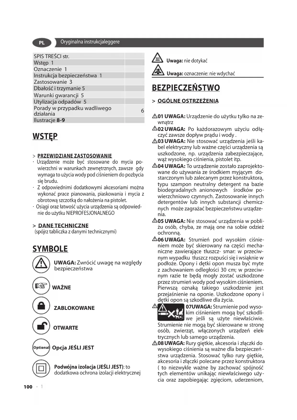 03 UWAGA: Nie stosować urządzenia jeśli ka- bel elektryczny lub ważne części urządzenia są uszkodzone, np. urządzenia zabezpieczające, wąż wysokiego ciśnienia, pistolet itp.