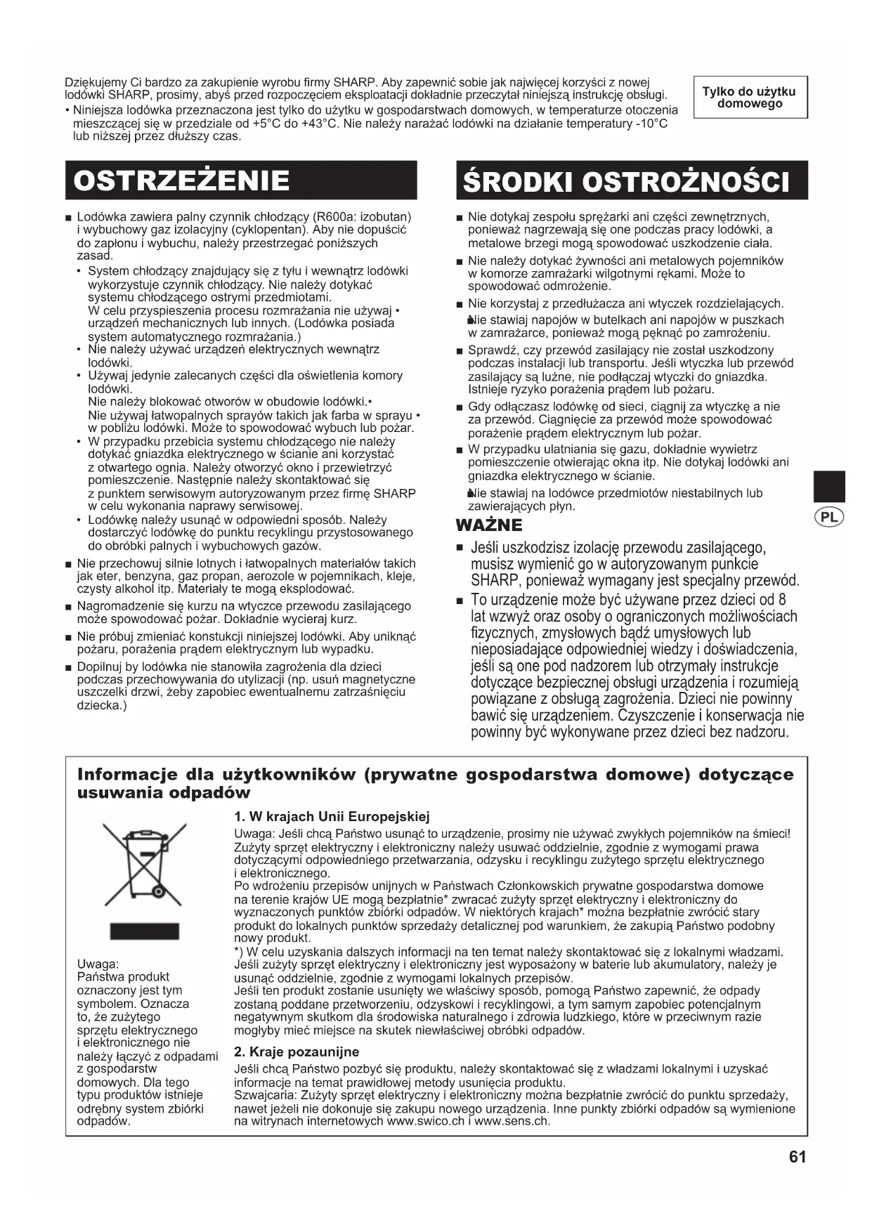 lodówki SHARP, prosimy, abyś przed rozpoczęciem eksploatacji dokładnie przeczytał niniejszą instrukcję obsługi.