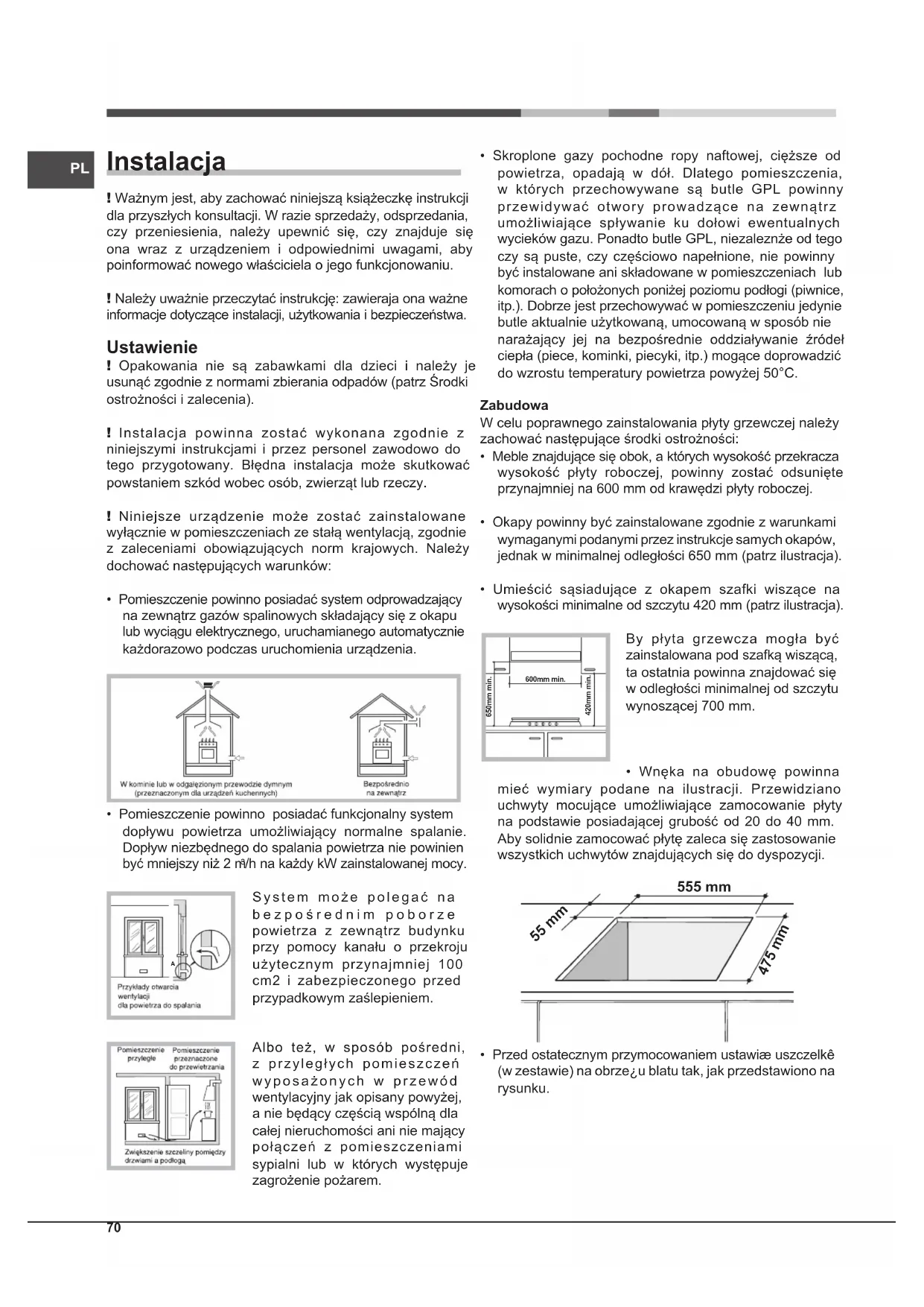- Urządzenia gazowe wymagają, dla swego poprawnego działania, regularnej wymiany powietrza. należy upewnić się, czy podczas ich instalowania przestrzegane były wymagania zawartye w odpowiednim paragrae dotyczącym “Ustawienia”.