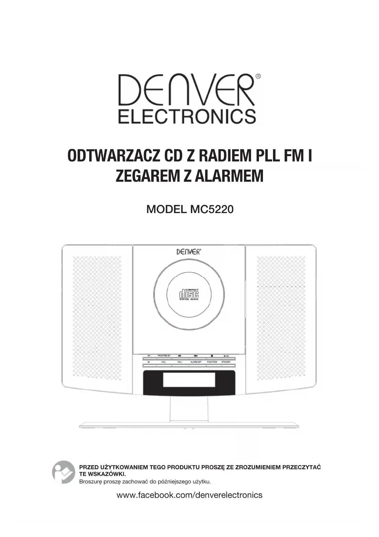 MODEL MC5220 PRZED UŻYTKOWANIEM TEGO PRODUKTU PROSZĘ ZE ZROZUMIENIEM PRZECZYTAĆ TE WSKAZÓWKI. Broszurę proszę zachować do późniejszego użytku. www.facebook.com/denverelectronicsWSKAZÓWKI BEZPIECZEŃSTWA