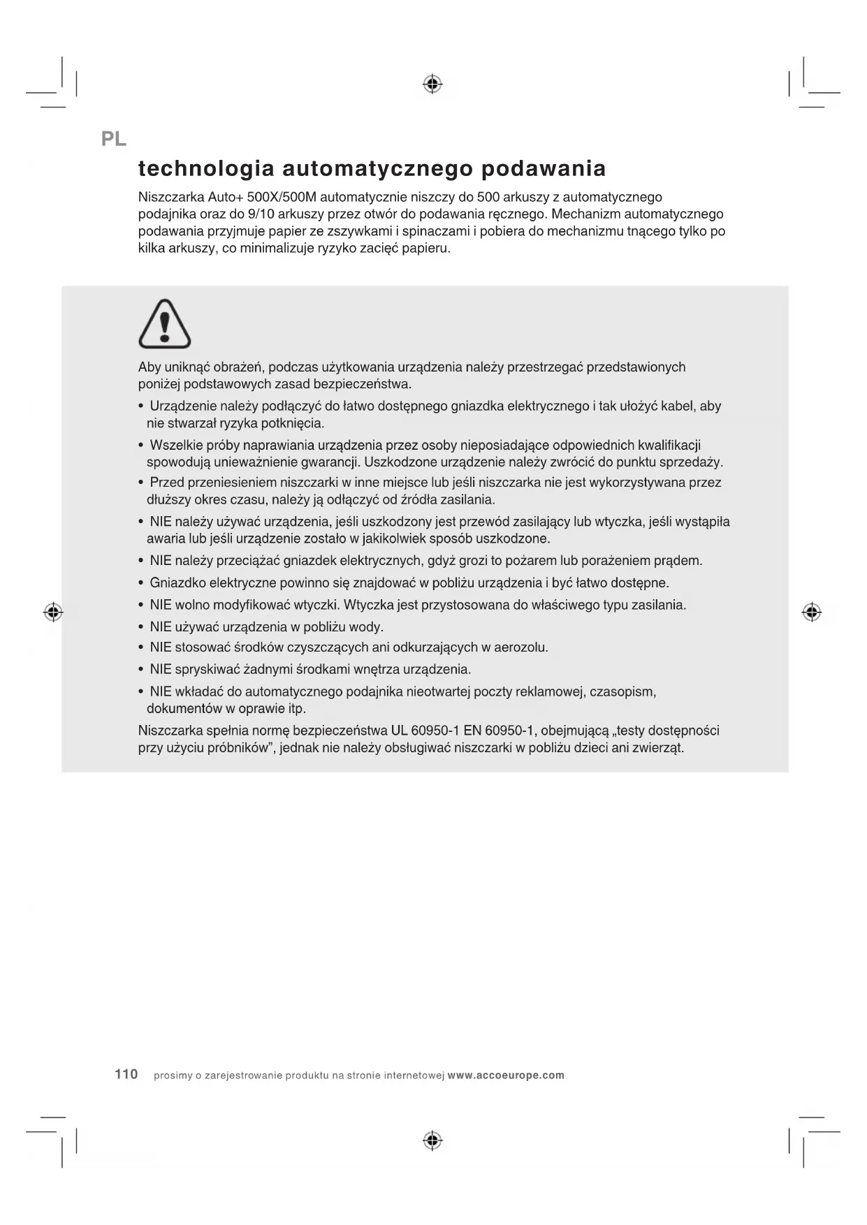 - NIE wkładać do automatycznego podajnika nieotwartej poczty reklamowej, czasopism, dokumentów w oprawie itp. Niszczarka spełnia normę bezpieczeństwa UL 60950-1 EN 60950-1, obejmującą „testy dostępności przy użyciu próbników”, jednak nie należy obsługiwać niszczarki w pobliżu dzieci ani zwierząt. technologia automatycznego podawania Niszczarka Auto+ 500X/500M automatycznie niszczy do 500 arkuszy z automatycznego podajnika oraz do 9/10 arkuszy przez otwór do podawania ręcznego. Mechanizm automatycznego podawania przyjmuje papier ze zszywkami i spinaczami i pobiera do mechanizmu tnącego tylko po kilka arkuszy, co minimalizuje ryzyko zacięć papieru.AUTO+ 500X&500M NISZCZARKI 111
