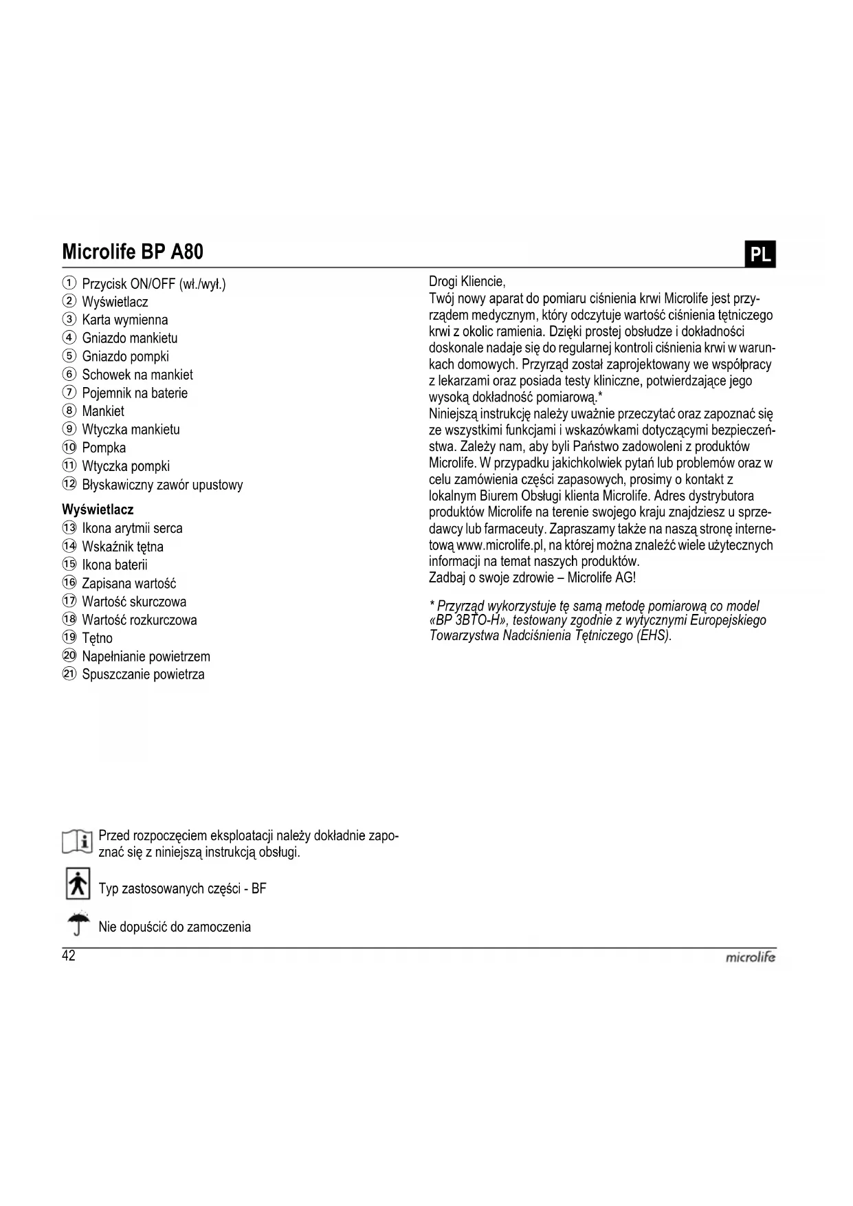 Прибор: 5 лет или 10000 измерений Комплектующие: 2 года42 Wyświetlacz Przed rozpoczęciem eksploatacji należy dokładnie zapo- znać się z niniejszą instrukcją obsługi. Typ zastosowanych części - BF Drogi Kliencie, Twój nowy aparat do pomiaru ciśnienia krwi Microlife jest przy- rządem medycznym, który odczytuje wartość ciśnienia tętniczego krwi z okolic ramienia. Dzięki prostej obsłudze i dokładności doskonale nadaje się do regularnej kontroli ciśnienia krwi w warun- kach domowych. Przyrząd został zaprojektowany we współpracy z lekarzami oraz posiada testy kliniczne, potwierdzające jego wysoką dokładność pomiarową.* Niniejszą instrukcję należy uważnie przeczytać oraz zapoznać się ze wszystkimi funkcjami i wskazówkami dotyczącymi bezpieczeń- stwa. Zależy nam, aby byli Państwo zadowoleni z produktów Microlife. W przypadku jakichkolwiek pytań lub problemów oraz w celu zamówienia części zapasowych, prosimy o kontakt z lokalnym Biurem Obsługi klienta Microlife. Adres dystrybutora produktów Microlife na terenie swojego kraju znajdziesz u sprze- dawcy lub farmaceuty. Zapraszamy także na naszą stronę interne- tową www.microlife.pl, na której można znaleźć wiele u żytecznych informacji na temat naszych produktów. Zadbaj o swoje zdrowie – Microlife AG!